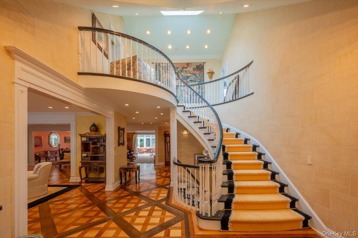 - Stairs featuring a high ceiling, recessed lighting, crown molding, and inlaid floor details