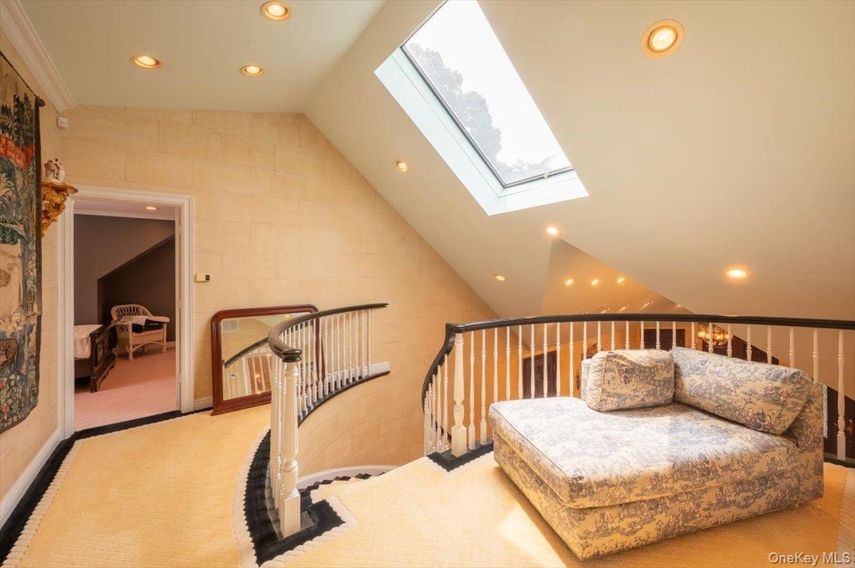 - Living area featuring lofted ceiling, recessed lighting, a skylight, and an upstairs landing