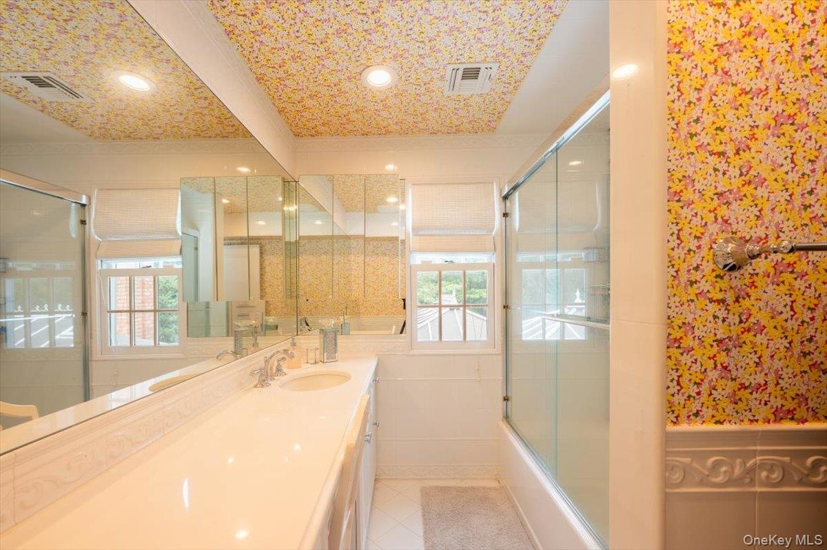 - Bathroom featuring vanity, combined bath / shower with glass door, and tile patterned flooring