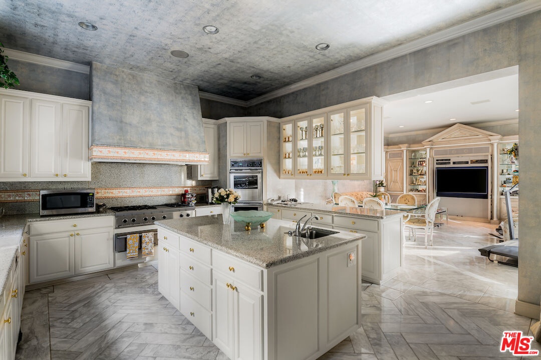 A rare offering in the prestigious, guard gated, Century Woods enclave in the heart of Century City. Spanning just over 5,600 square feet, this villa harmoniously blends traditional elegance with modern luxuries. A grand courtyard with a fountain and outdoor seating welcomes guests through double height entry doors into the formal entry with a dramatic spiral staircase as the focal point. Pristine marble floors and arched doorways are some of the many ornate designs carried throughout, displaying a fine attention to detail. A formal dining room, showcasing mirrored ceilings, and a separate den provide seamless flow into the courtyard, integrating indoor-outdoor living. The chef's kitchen is fully equipped with stainless steel appliances and an abundance of cabinetry. On the upper level, also accessible by elevator, is the primary suite complete with a balcony, marble fireplace, dual walk-in closets and dual bathrooms, including Sherle Wagner marble fixtures. Located on the other wing of the upper level are three additional guest bedrooms, all with en-suite baths plus a spacious office with its own bathroom. An attached three car garage ensures ample parking and storage. Century Woods provides all of the amenities of a five star resort including a community pool, tennis courts, a fitness center and 24 hour security while being minutes away from renowned dining and entertainment.