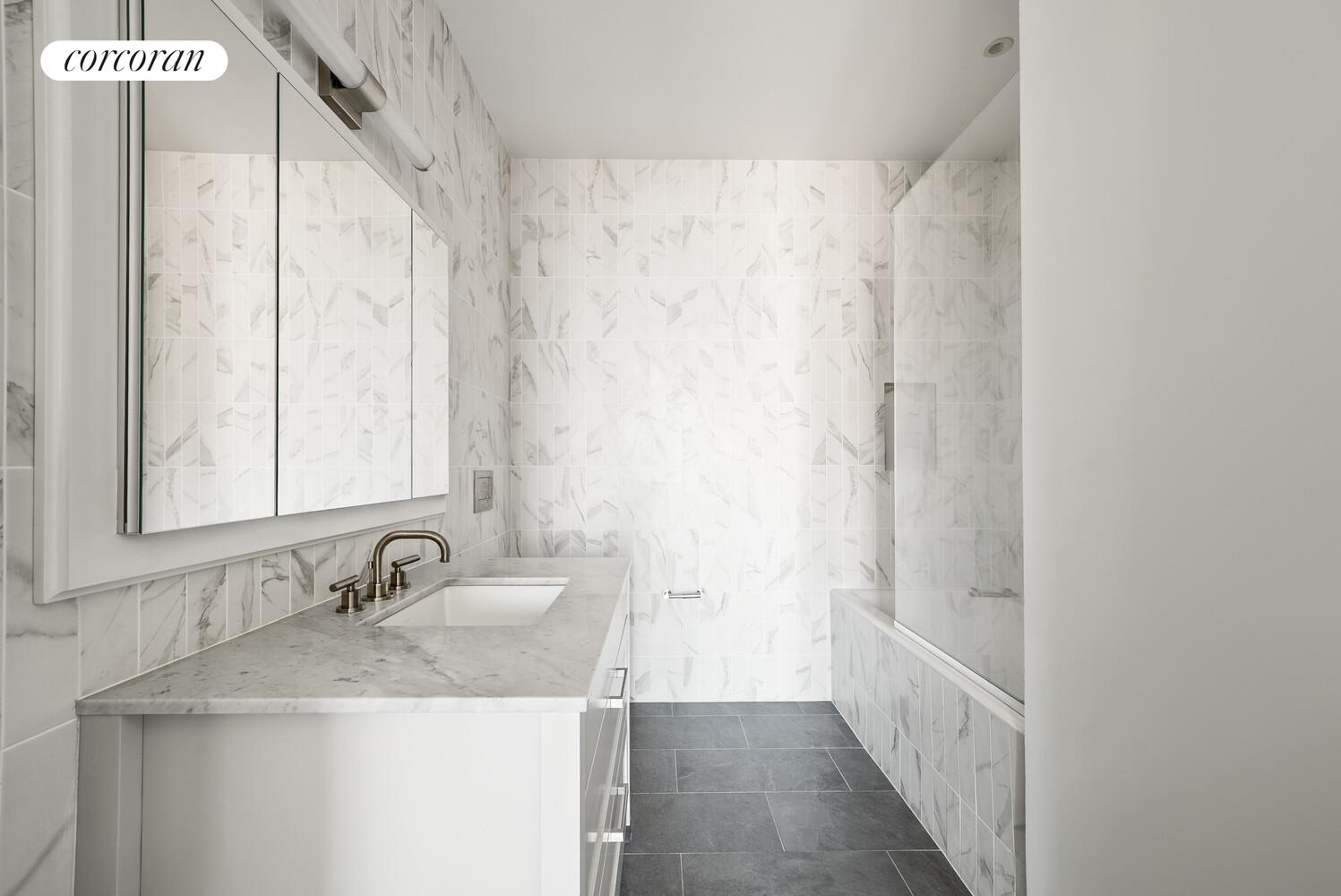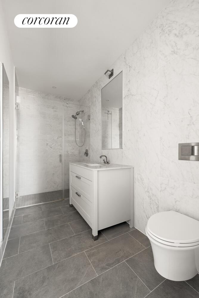 Indulge in spa-like bathrooms adorned with Camden Satin Nickel sconces and Carrara marble tiled walls that envelop you in luxury. A custom satin, nickel, and glass enclosure invites you to shower in style, while Italian porcelain floors provide a touch of sophistication. Vanities by Kohler, dovetail mirrors, Kohler toilets, and full-length recessed Robern medicine cabinets elevate your daily routine. Step through the shaker panel solid core doors to discover spacious bedrooms, an exquisite all-marble master bathroom, and the convenience of in-unit Bosch stackable washer and dryer.