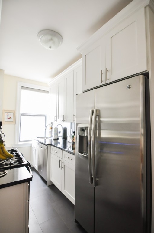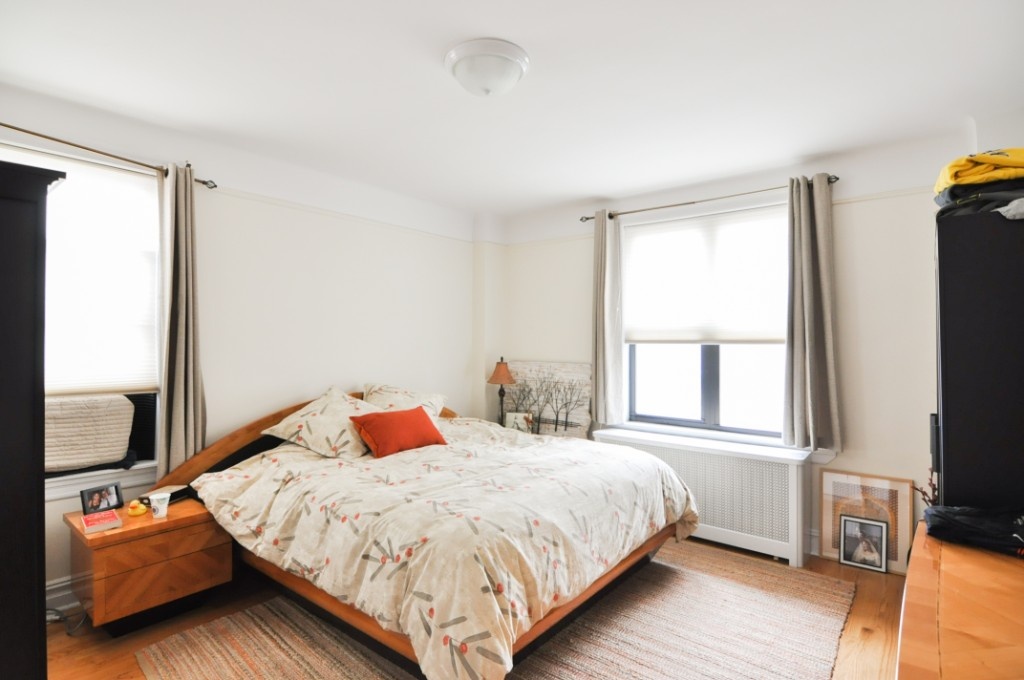 The primary bedroom features a walk in closet, south facing windows and an ensuite bathroom. Each bedroom has plenty of space for a king size bed and other furniture. With oversized rooms, hardwood floors and high ceilings, this charming apartment has the classic pre-war building feel.