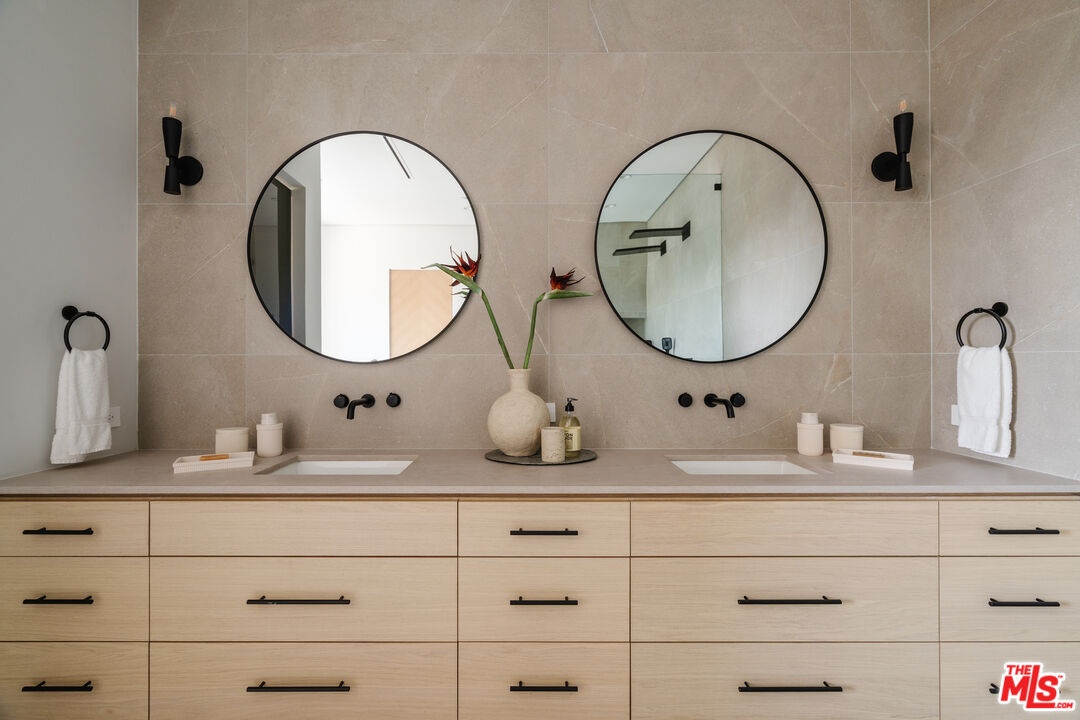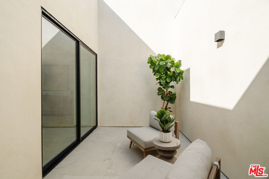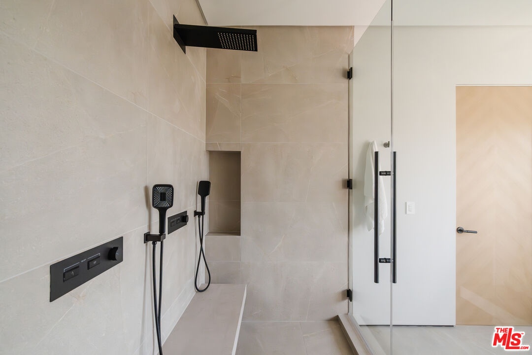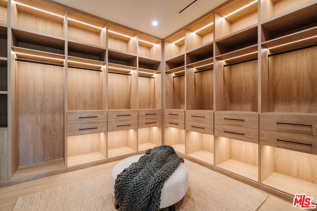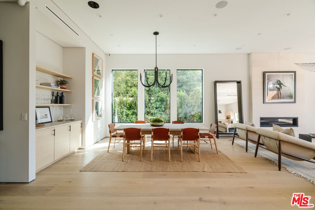Presenting this exceptional 2023 custom new construction a 5-bedroom, 5.5-bathroom smart home with rooftop that blends refined luxury with modern functionality. From the moment you step through the custom oak entry door, you're greeted by a fully automated Control4 smart system that tailors lighting, sound, and climate to your preferences, setting the tone for effortless living in this solar-powered sanctuary. The main level is centered around a striking Great Room featuring an illuminated wine wall and 16-foot retractable glass pocket doors that dissolve the boundary between indoor and outdoor living. The doors open to a stunning KAYU Golden Balau hardwood deck, seamlessly connecting the interiors to a vibrant backyard oasis. At the heart of the home, the chef's kitchen stuns with Shinnoki Milk Oak cabinetry and sleek porcelain travertine countertops and island, complemented by a premium built-in Wolf stovetop. A unique pass-through window opens directly to the backyard for easy entertaining. The backyard is a resort-style retreat with a heated pool and jet spa, both controlled by an automated system with customizable lighting and temperature settings. New upgrades include a sauna, cold plunge, and an outdoor dining area perfect for unwinding in total luxury. Ascend the floating staircase bathed in natural light from oversized picture windows and a skylight to discover four spacious ensuite bedrooms, each featuring custom floor-to-ceiling cabinetry and wide-plank European white oak flooring. The primary suite is a true sanctuary, with a custom limewashed accent wall, a private balcony overlooking the backyard, and a serene open-air lounge area. The suite also includes a cozy linear fireplace, a built-in wet bar with Shinnoki Milk Oak cabinetry, and a walk-in closet with LED-lit, custom shelving and cabinetry. The spa-like primary bathroom is dressed in full-slab stone tile and features dual vanities, dual shower heads, a freestanding soaking tub, and a smart toilet with bidet.Additional highlights include a state-of-the-art media room with 7.1 surround sound, a professionally installed security system, a rooftop entertaining area spanning approximately 800 square feet with a built-in grill and fire pit, and sweeping views of the Hollywood Hills that glow golden at sunset. The finished garage is complete with an EV charger and brand-new epoxy floors, ensuring every detail of this property is as functional as it is beautiful. This one-of-a-kind home was designed for elevated living, seamlessly combining organic materials, innovative design, and high-end features in every corner. An extraordinary offering one of the best walkable areas in Los Angeles.