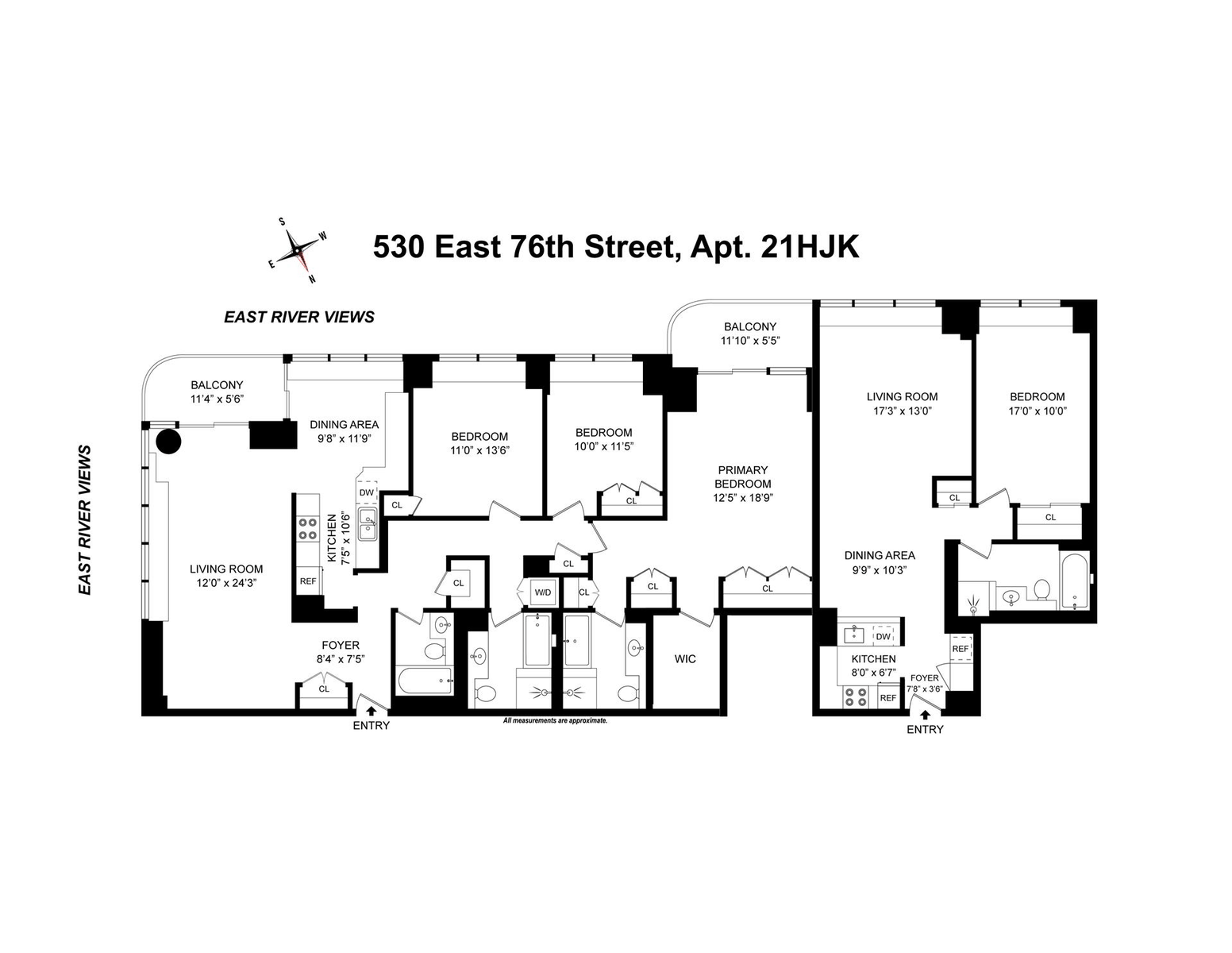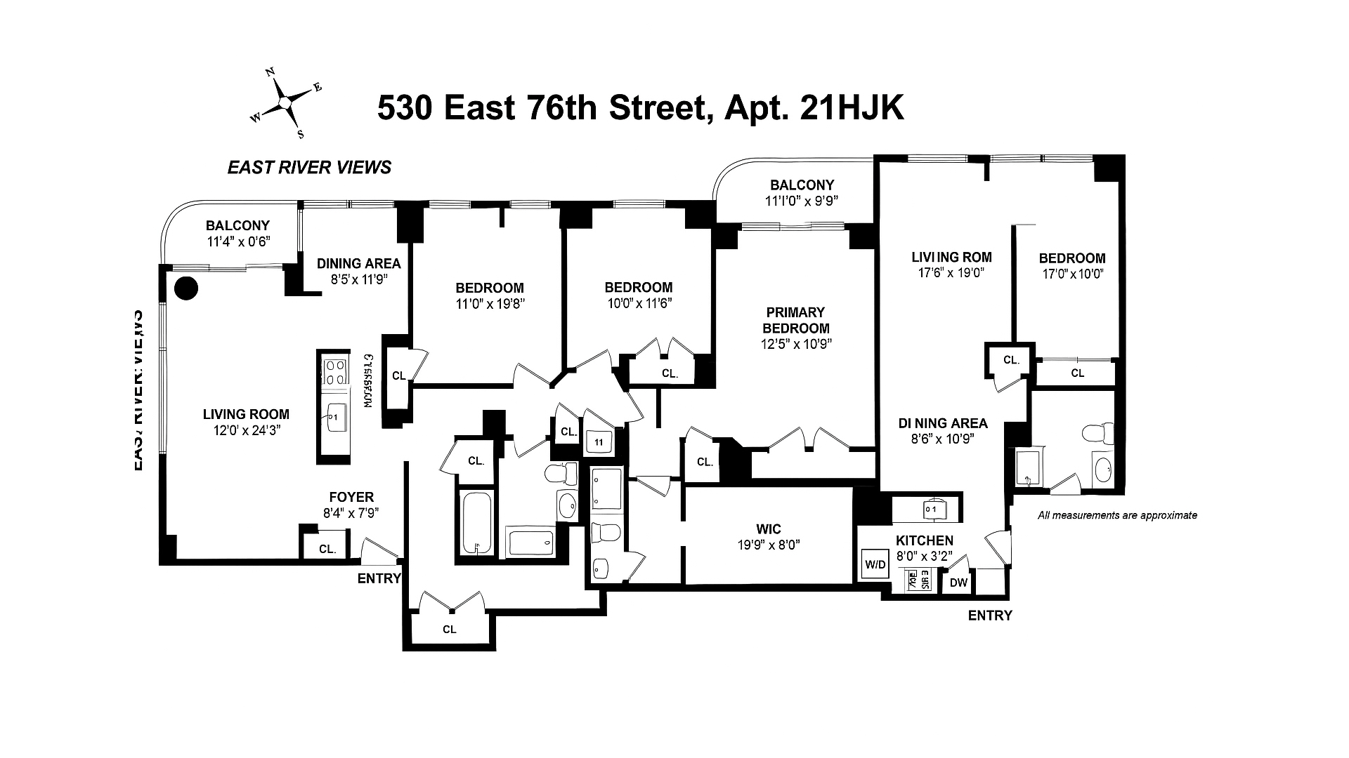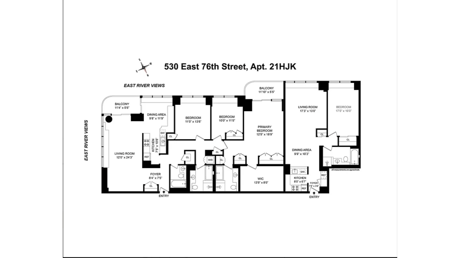 Perched high on the 21st floor, both elegant residences have individual entrances, brilliant natural light, and breathtaking open views of the East River, bridges, and stunning cityscapes. 21HJ is an expansive southeastern corner apartment with a gracious layout brightened by walls of windows facing the river, and 2 private balconies (off the living room and primary suite) for the ultimate outdoor enjoyment. Beautiful hardwood floors and refined finishes grace the ambience throughout. Entertain in the large living room and serve cocktails on the balcony, while preparing meals in the spacious eat-in kitchen appointed for the chef. There's also a washer-dryer, and abundant closet space that includes a huge walk-in closet in the primary bedroom.