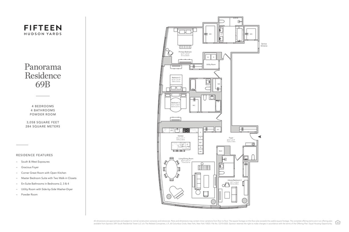Located on the prized southwest corner of Fifteen Hudson Yards, this remarkable home enjoys grand proportions and mesmerizing views of the Hudson River, New York Harbor, Statue of Liberty, Freedom Tower and Downtown skyline from morning to night! The gracious 6-foot wide foyer leads to the giant great room with ceilings up to 10'10" and stunning views in every direction. The oversized open kitchen features a grand marble island, Bulthaup cabinetry with large pantry and Miele appliances including double ovens and wine storage. The master suite is very private, enjoying river views, an oversized bathroom with soaking tub and large shower and two massive walk-in closets. Two additional bedroom suites enjoy en-suite baths and a walk-in laundry room, while the fourth bedroom could also double as a library, office or media room and could be opened to the great room if desired.