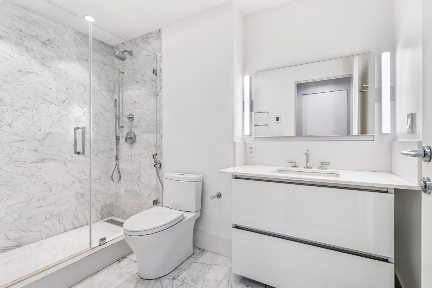 The chef's kitchen features state-of-the-art appliances and sleek finishes, while the spa-like bathroom offers luxurious touches such as a Robern vanity and mirror, heated floors, and heated towel bars. Throughout the home, custom-designed closets add both style and function.