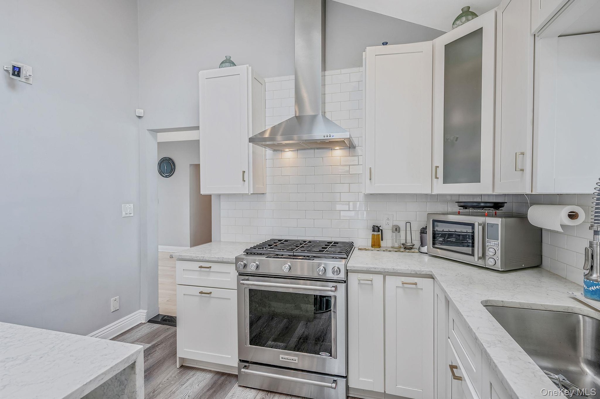 - Kitchen featuring stainless steel appliances, light stone countertops, wall chimney range hood, decorative backsplash, and white cabinets
