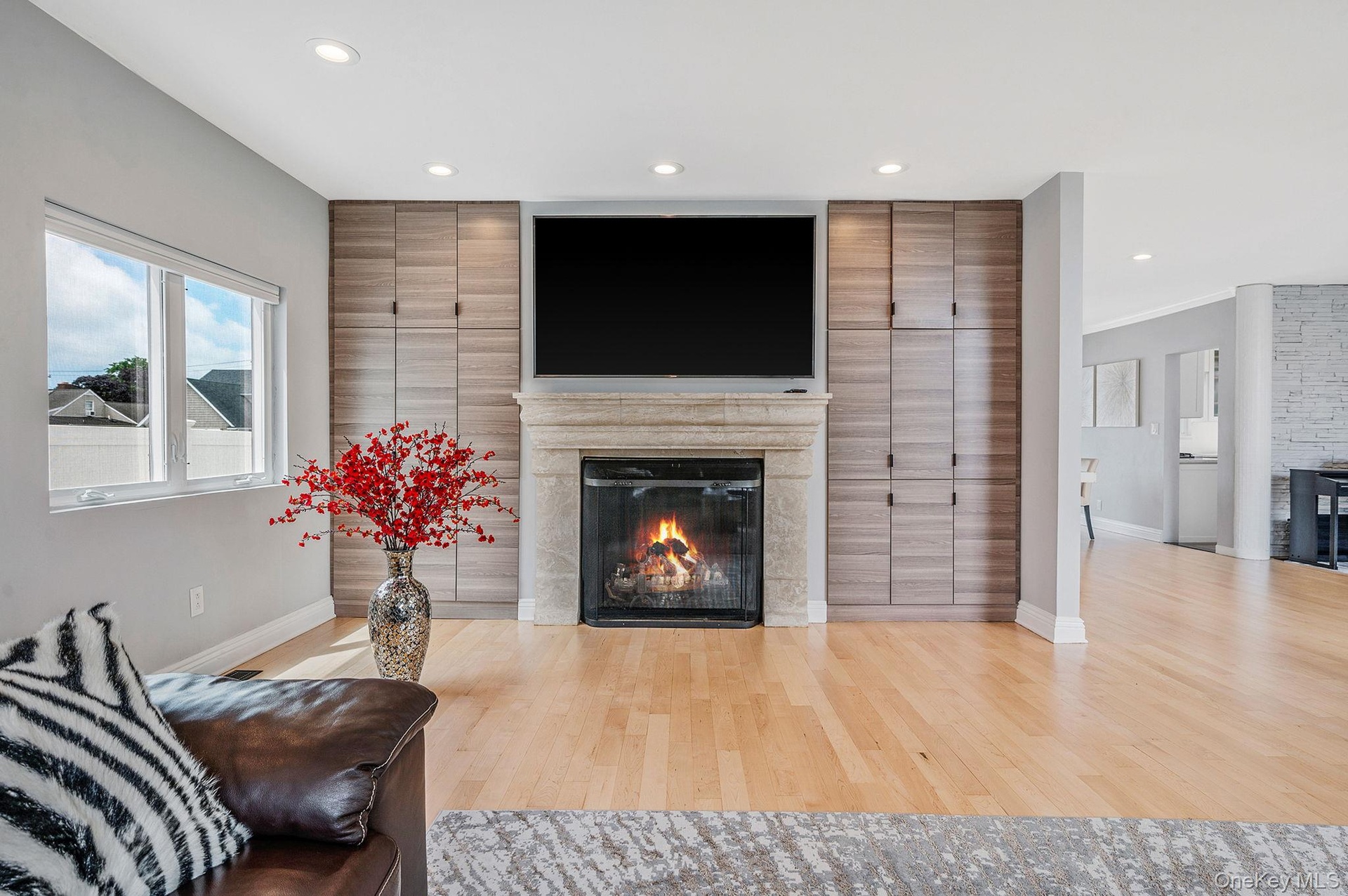 - Living area with recessed lighting, light wood-style floors, and a fireplace