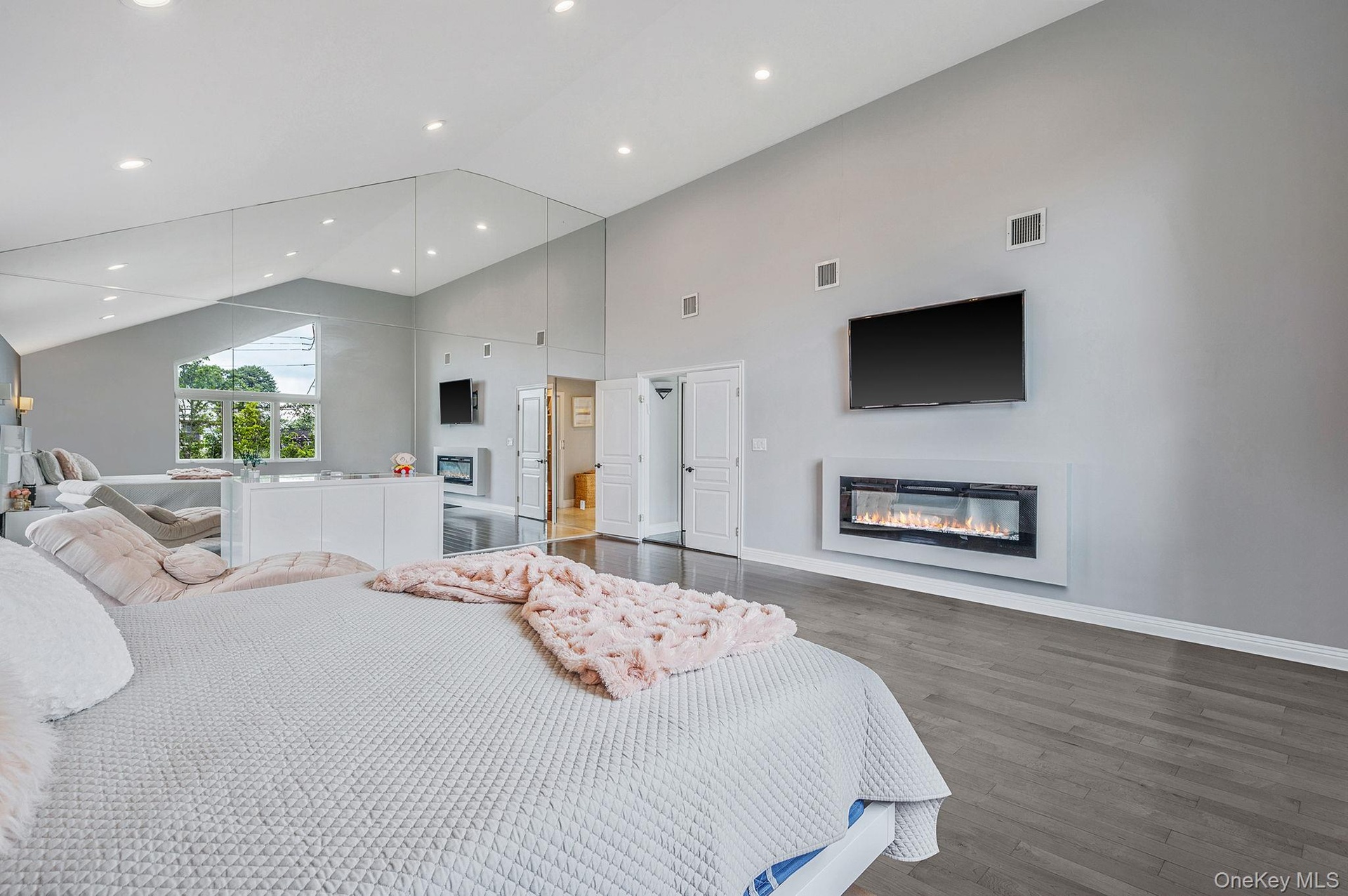 - Bedroom featuring high vaulted ceiling, a glass covered fireplace, wood finished floors, and recessed lighting