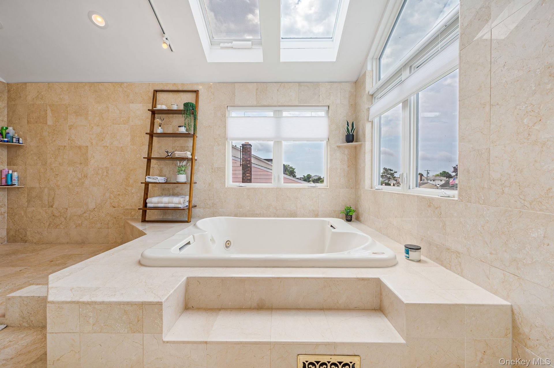 - Bathroom featuring tile walls, a tub with jets, and a skylight