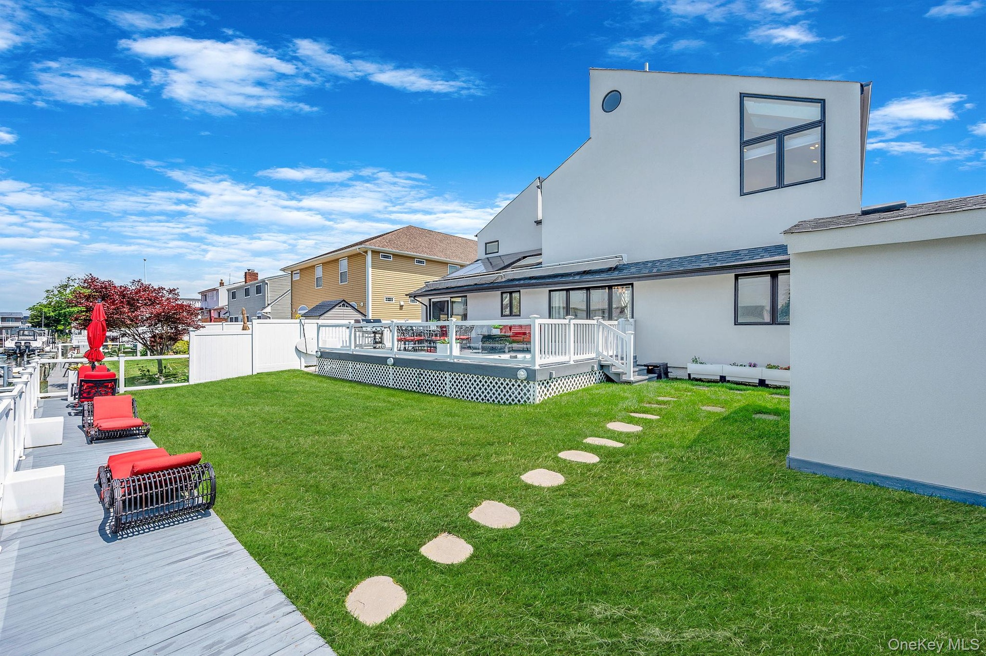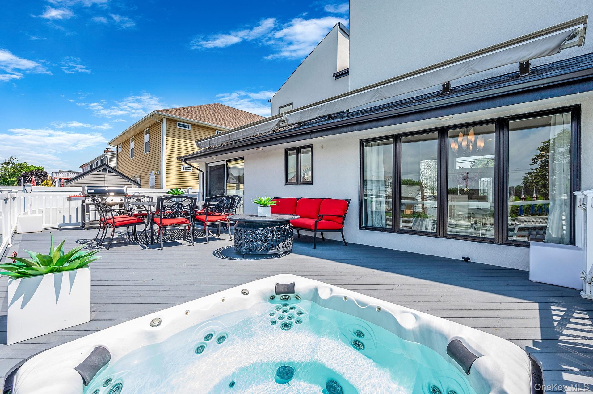 Step into the backyard and take in the breathtaking water views framed by sleek glass railings. Enjoy seamless indoor-outdoor living with a sliding glass door leading to an expansive deck and a gorgeous, surreal backyard—complete with a hot tub and new navy bulkhead for direct access to the wide canal. Its prime location allows easy navigation to the open bay in minutes, with nearby marinas, parks, golf courses, and South Shore beaches just a short ride away.