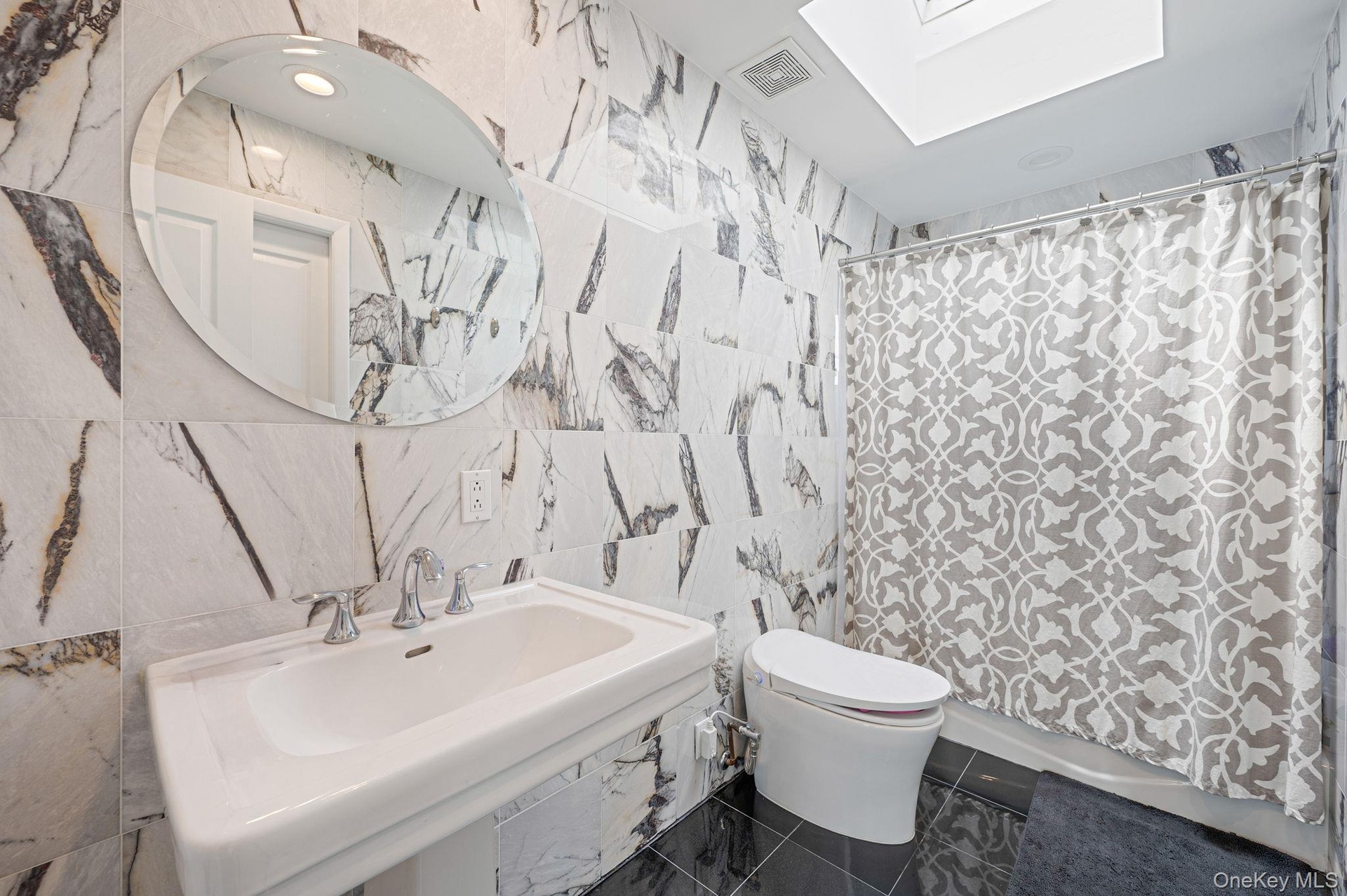 - Bathroom featuring tile walls, a skylight, and shower / tub combo