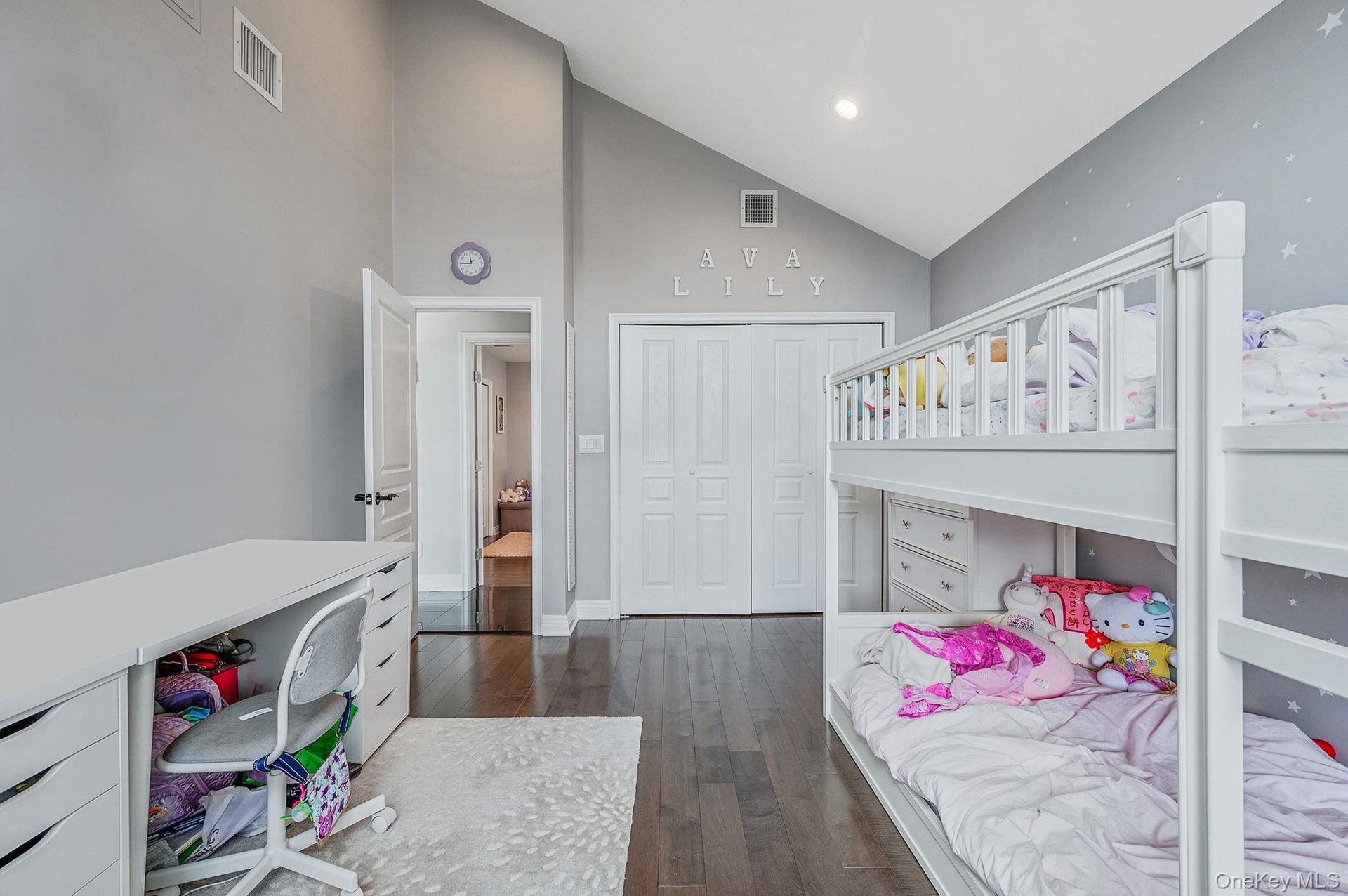 - Bedroom featuring dark wood finished floors, high vaulted ceiling, a closet, and recessed lighting