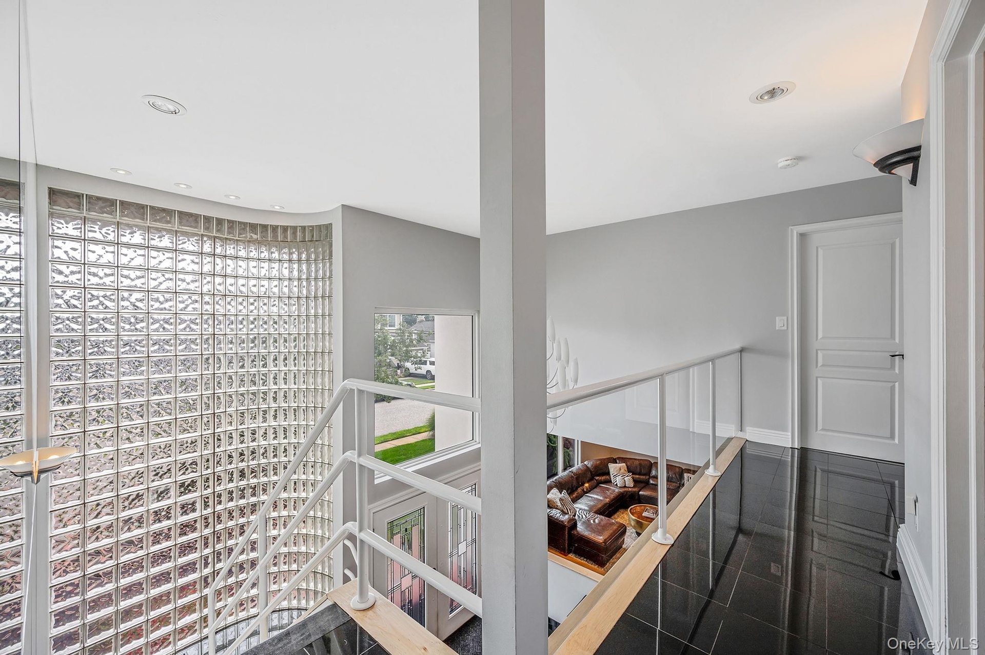 - Hall featuring recessed lighting, an upstairs landing, and granite tiled floors