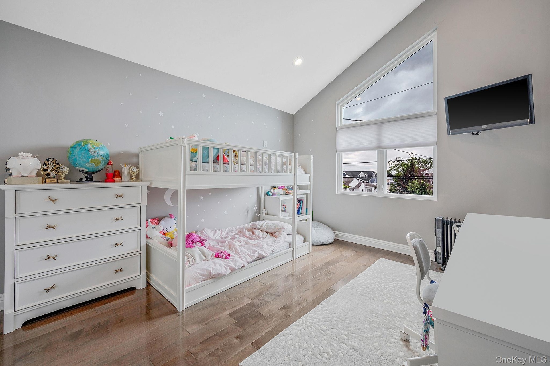 - Bedroom with hardwood / wood-style floors, high vaulted ceiling, and recessed lighting