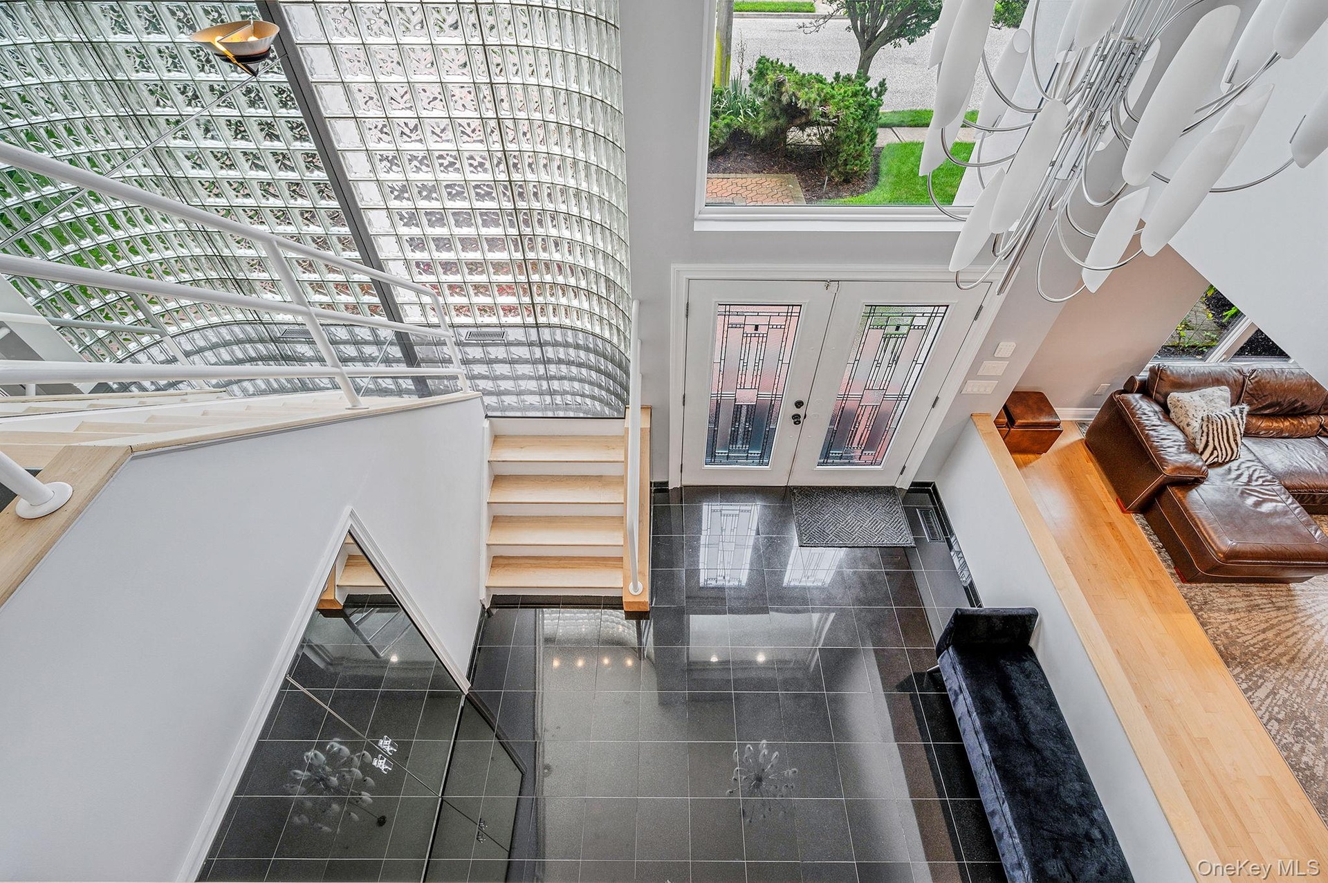 - Entryway featuring granite tiled floors, a towering ceiling, french doors, stairway, and recessed lighting