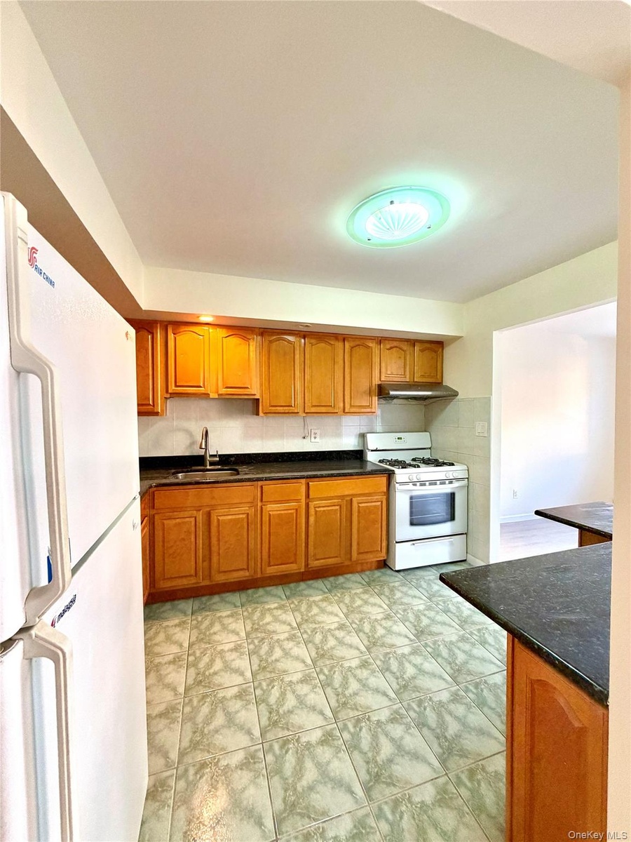 - Kitchen featuring white appliances, brown cabinetry, light tile patterned floors, tasteful backsplash, and dark stone counters