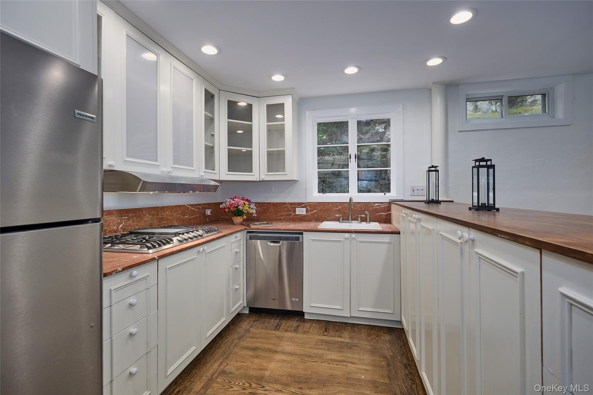 - Kitchen with wooden counters, appliances with stainless steel finishes, recessed lighting, dark wood-style floors, and white cabinets