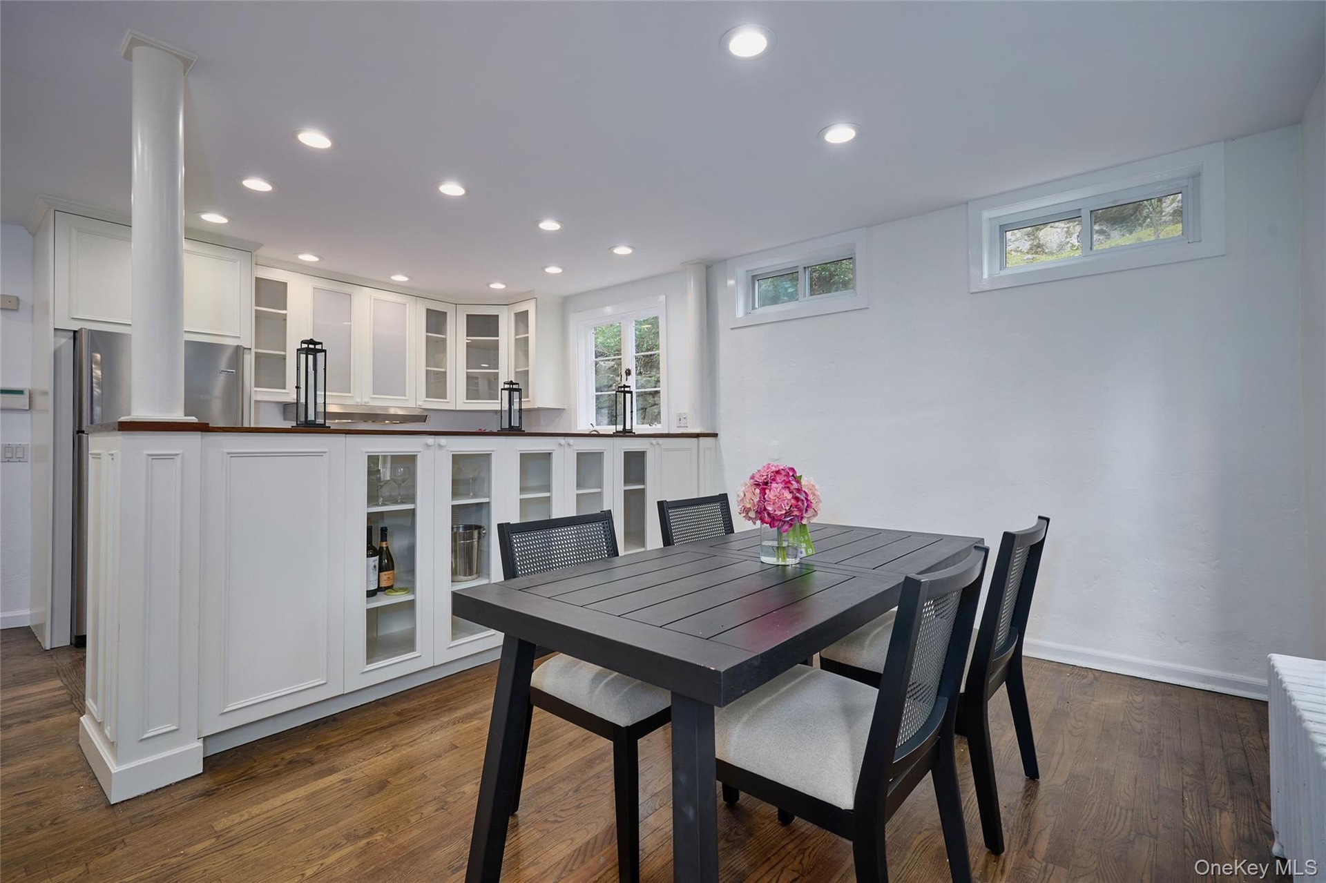 - Dining area featuring dark wood-type flooring, recessed lighting, and radiator