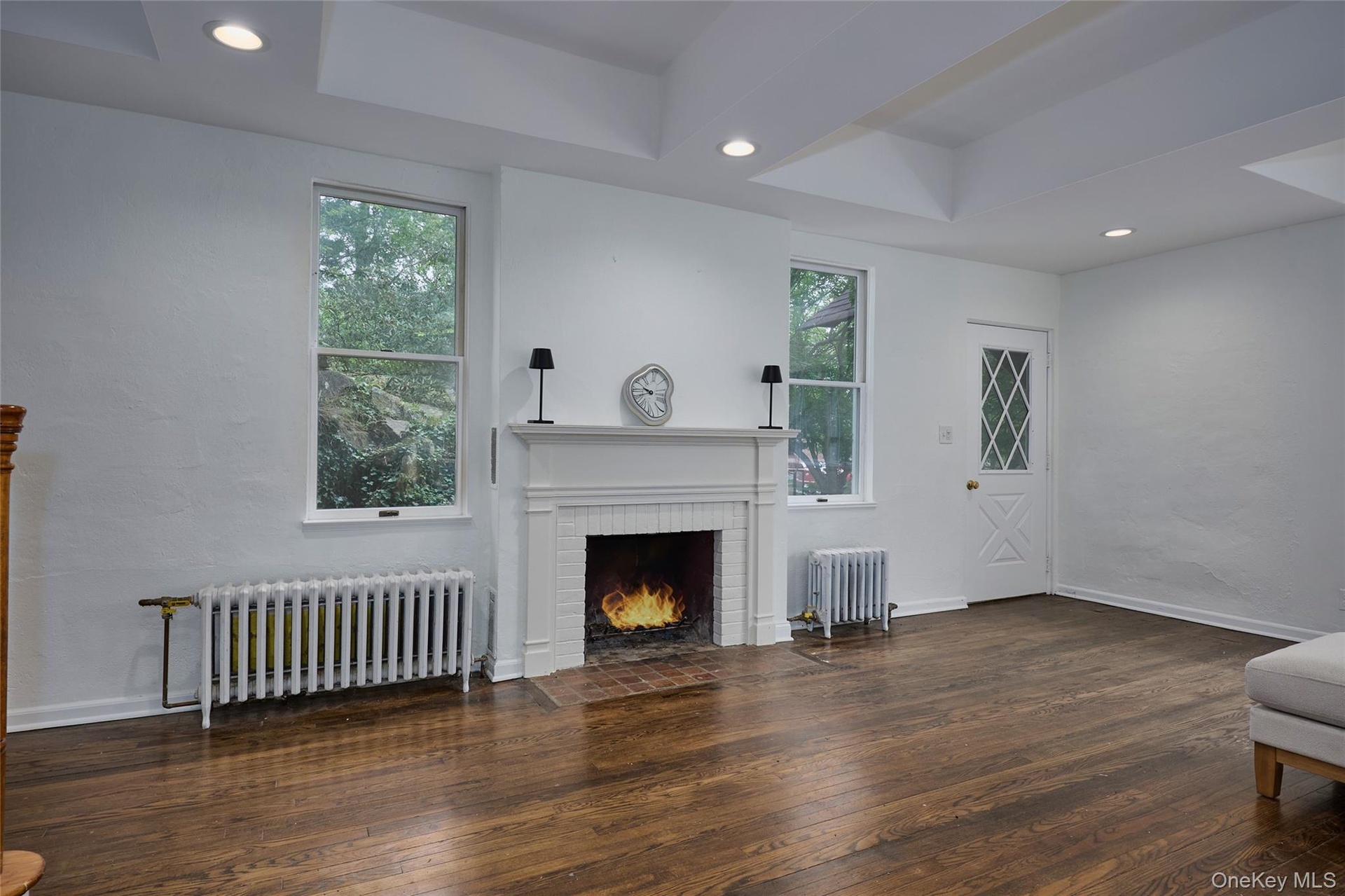 - Living area with dark wood-type flooring, radiator, a brick fireplace, and recessed lighting