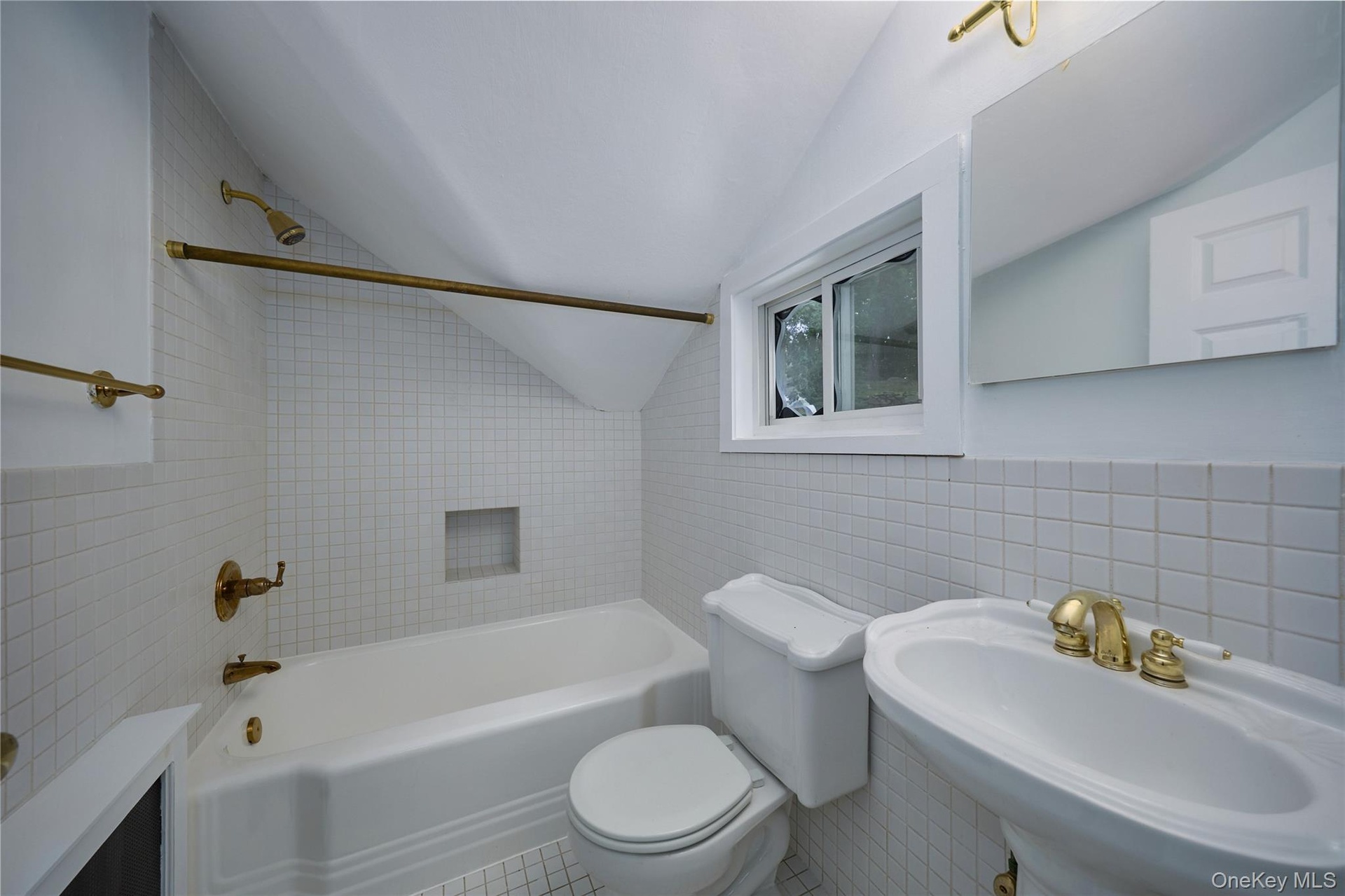 - Bathroom featuring tile walls, washtub / shower combination, and lofted ceiling