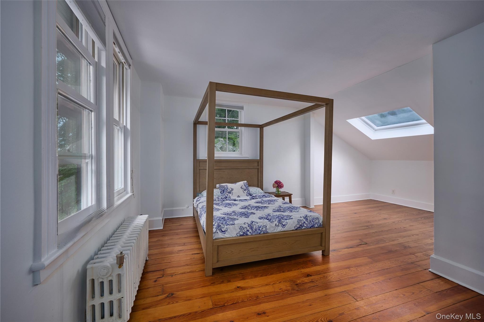 - Bedroom with radiator heating unit, hardwood / wood-style floors, vaulted ceiling, and a skylight