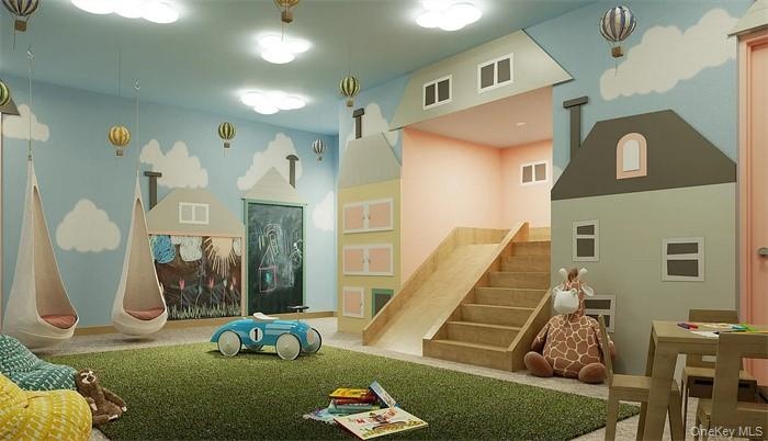 - Game room with dark wood-type flooring, a towering ceiling, and billiards