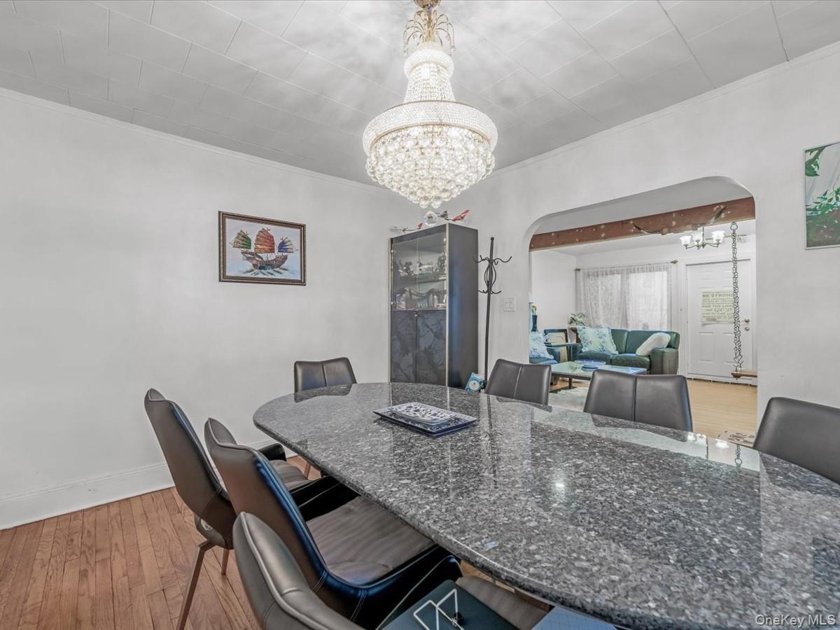 - Dining room featuring a chandelier, arched walkways, hardwood / wood-style flooring, and ornamental molding