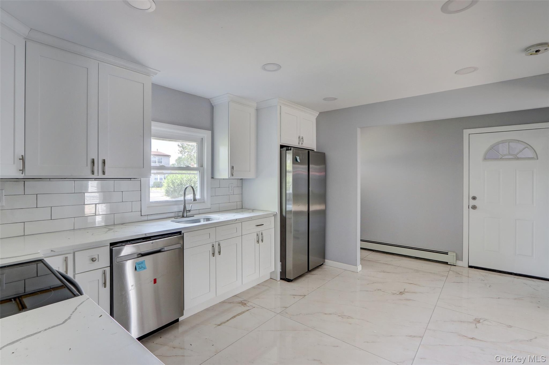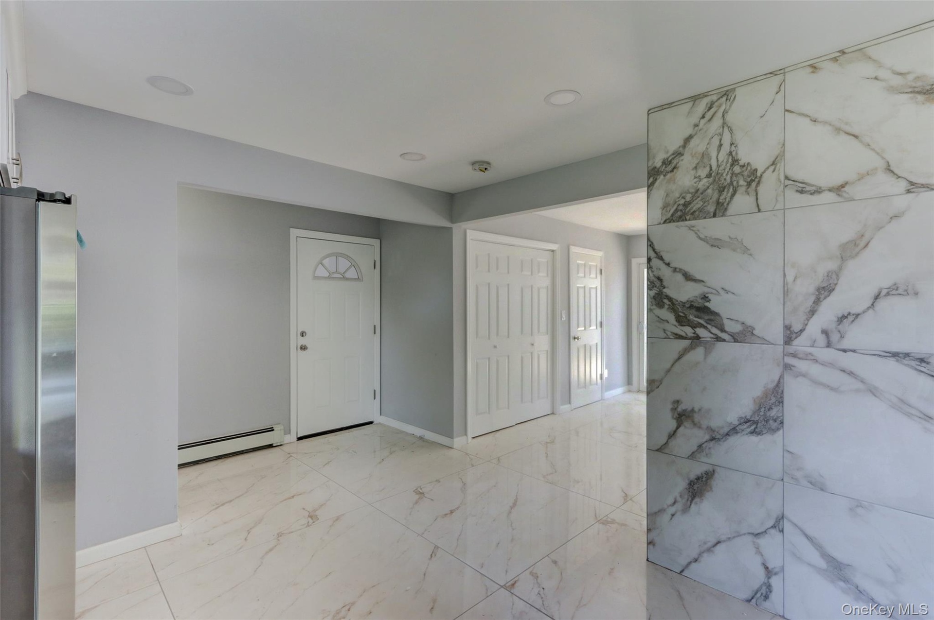 - Foyer featuring light marble finish floors and a baseboard radiator