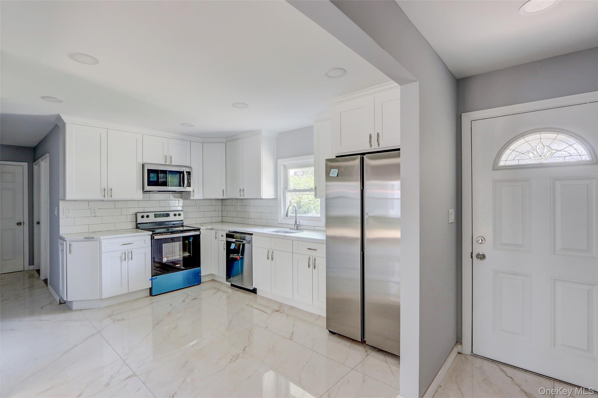 - Kitchen featuring light marble finish floors, stainless steel appliances, decorative backsplash, and recessed lighting
