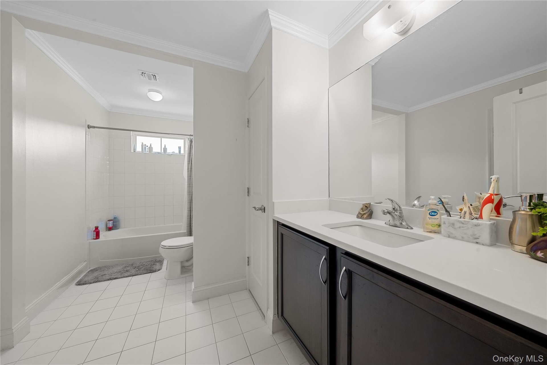 - Bathroom with crown molding, shower / tub combo, vanity, and light tile patterned flooring