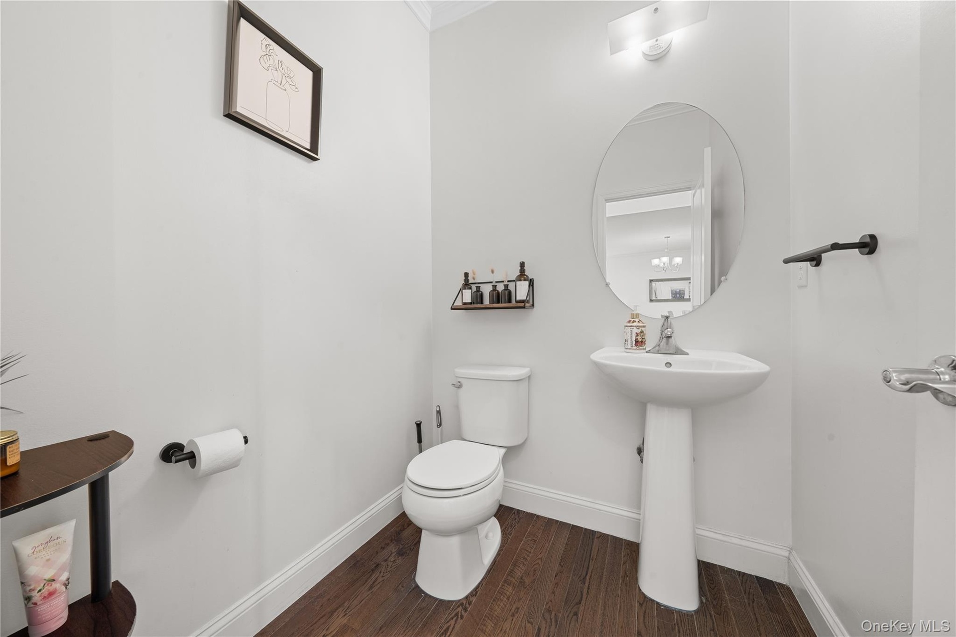 - Bathroom featuring dark wood finished floors and ornamental molding