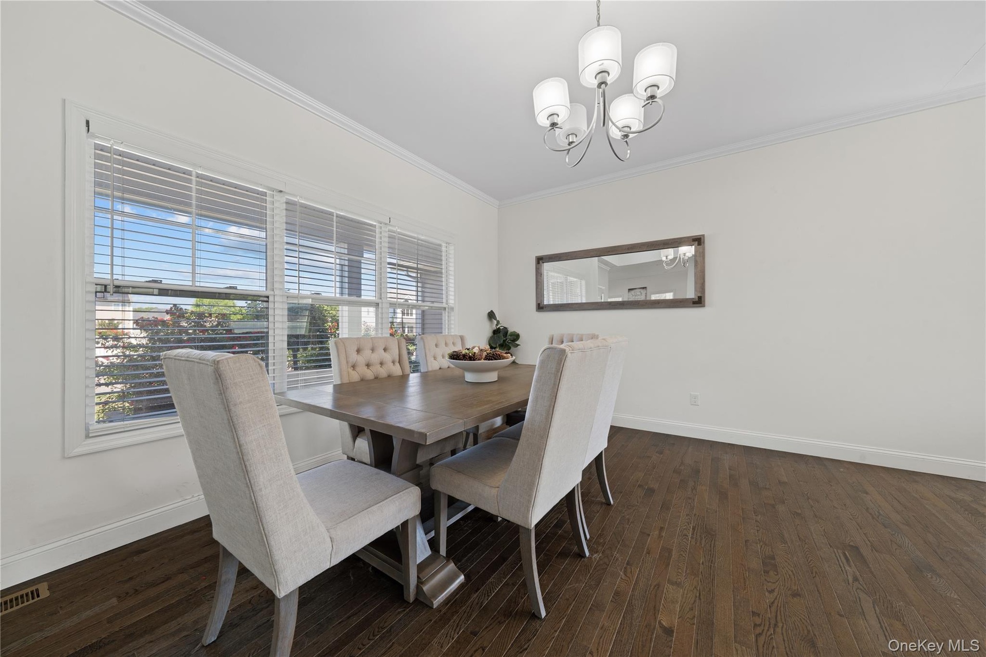 - Dining space with crown molding, dark wood finished floors, and a chandelier