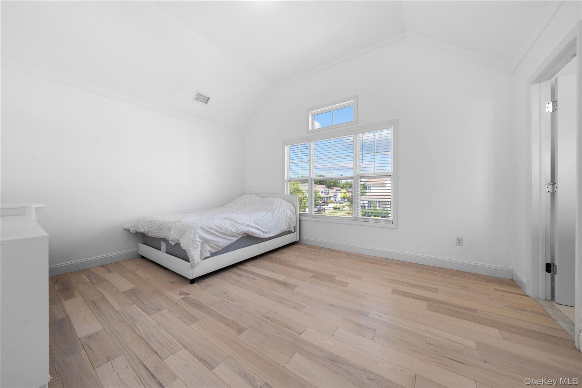 - Bedroom featuring light wood finished floors, high vaulted ceiling, and ornamental molding