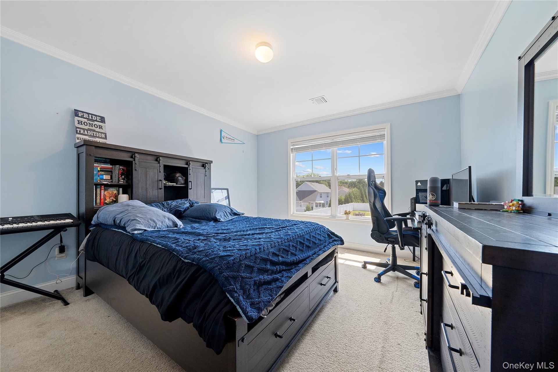 - Bedroom featuring light carpet, crown molding, and recessed lighting