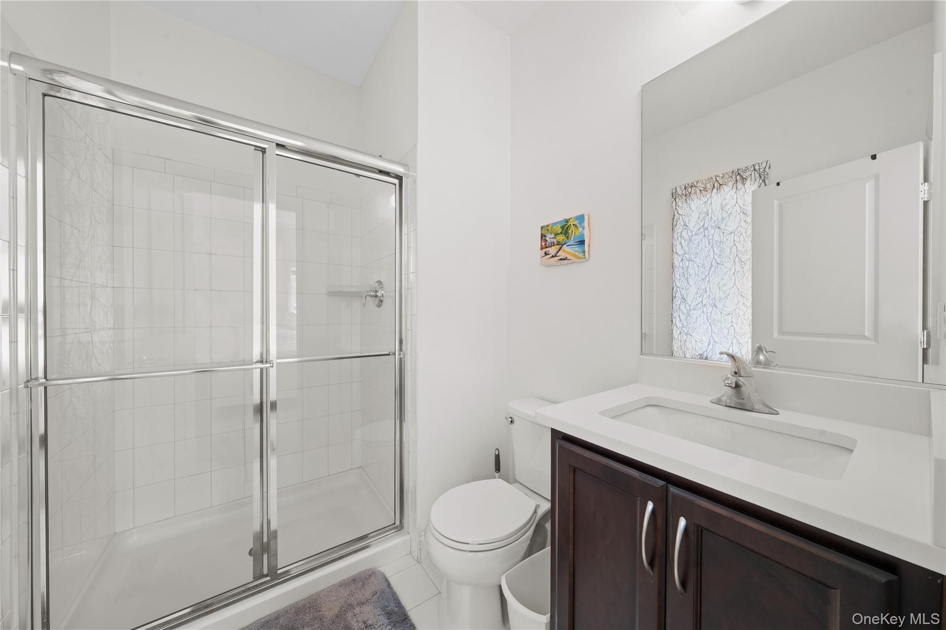 - Full bath featuring a stall shower, vanity, and light tile patterned flooring