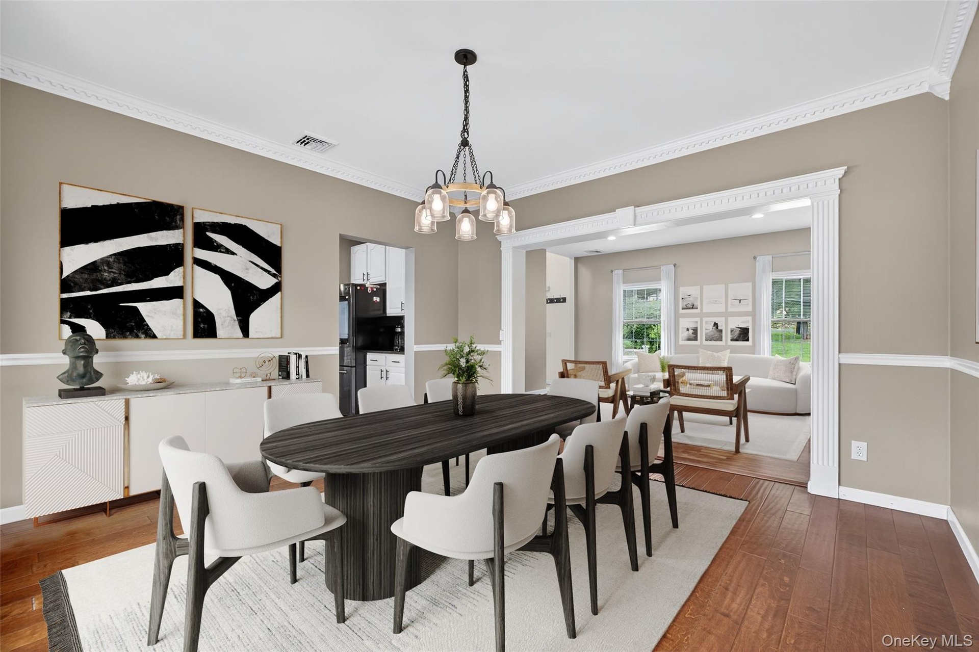- Virtually Staged - Dining room with wood-type flooring, crown molding, and a chandelier