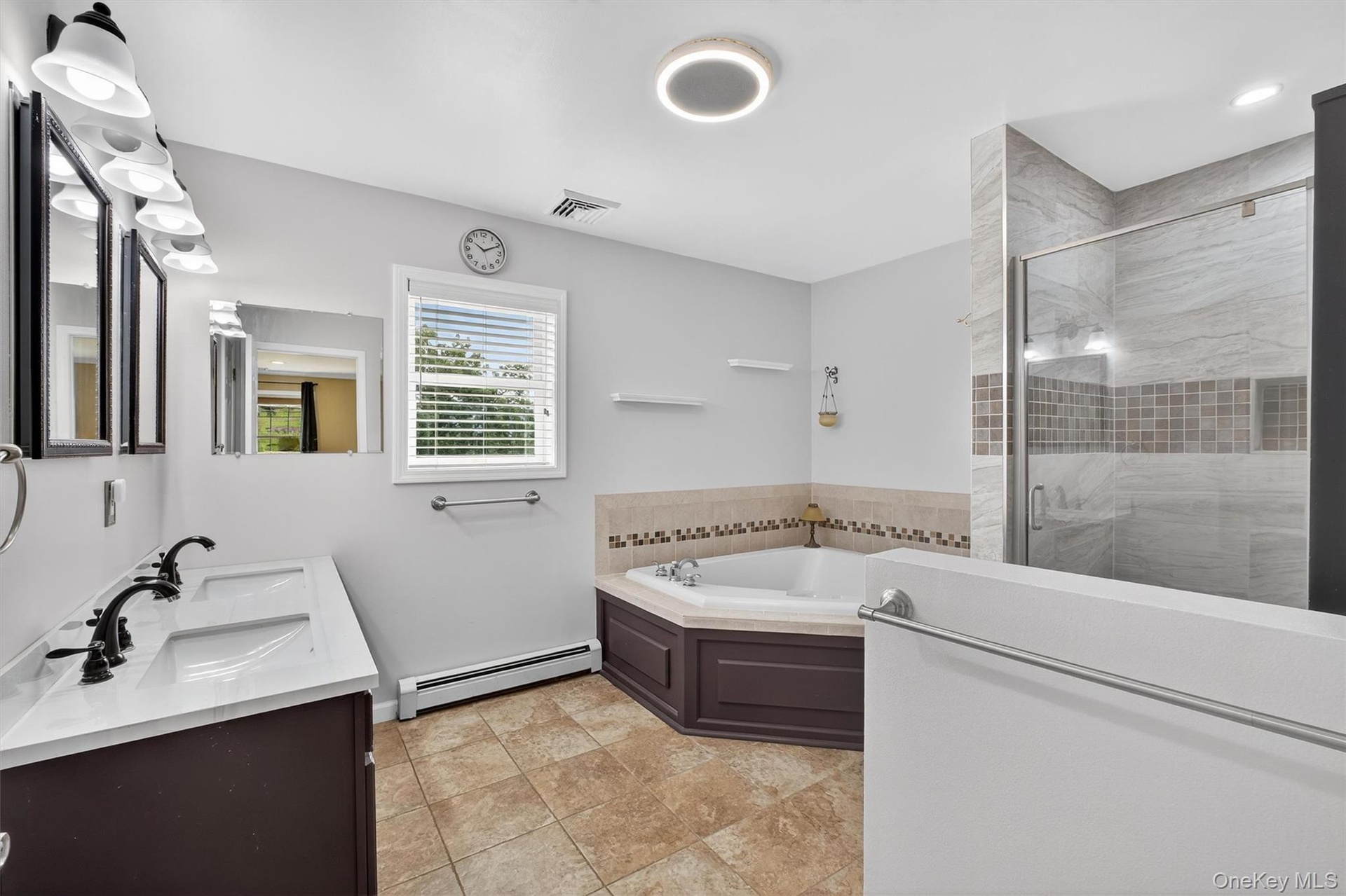 - Bathroom featuring baseboard heating, a garden tub, a shower stall, and double vanity
