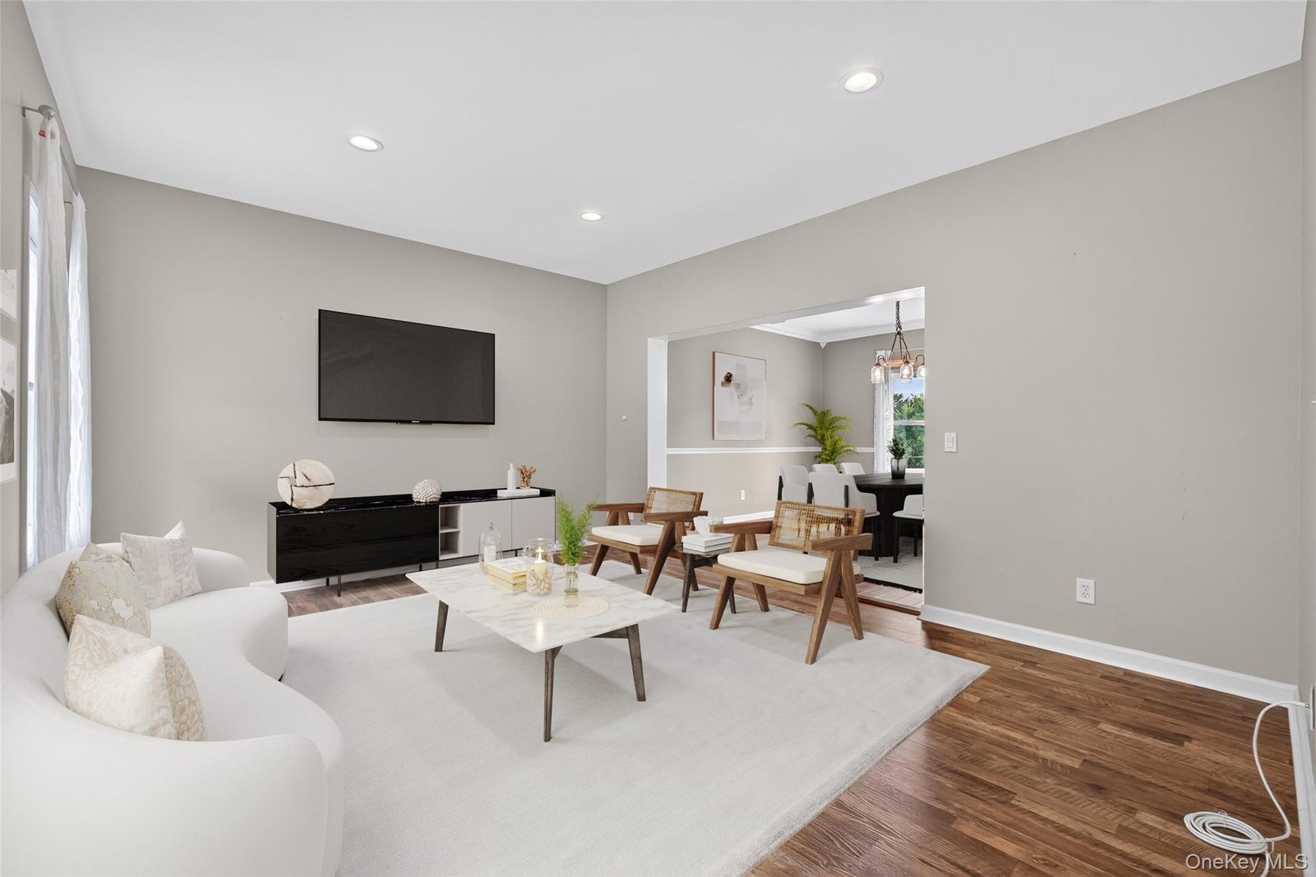 - Virtually Staged - Living room with wood finished floors, recessed lighting, and a chandelier