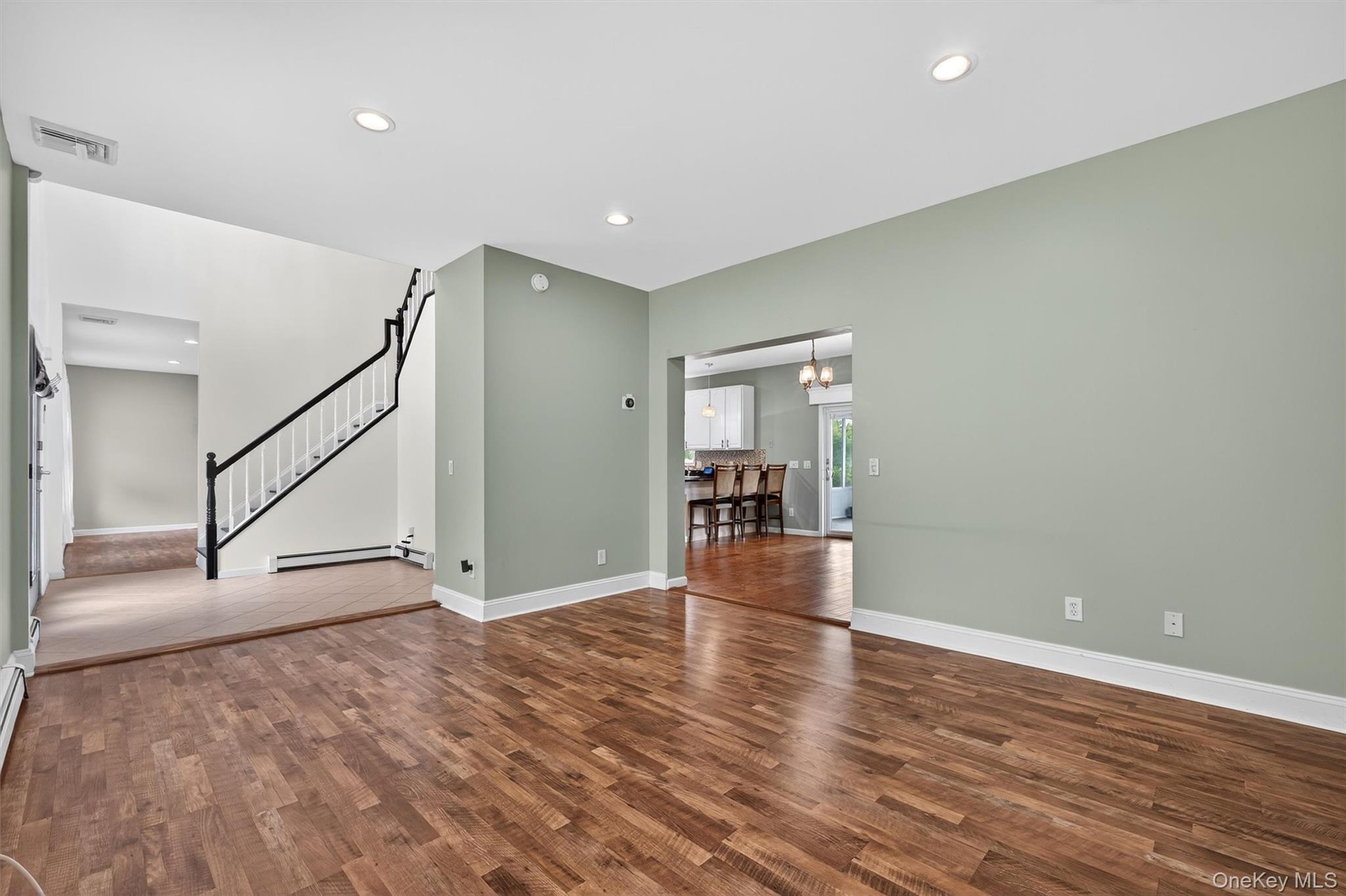 - Family room with a baseboard radiator, wood finished floors, stairway, and recessed lighting