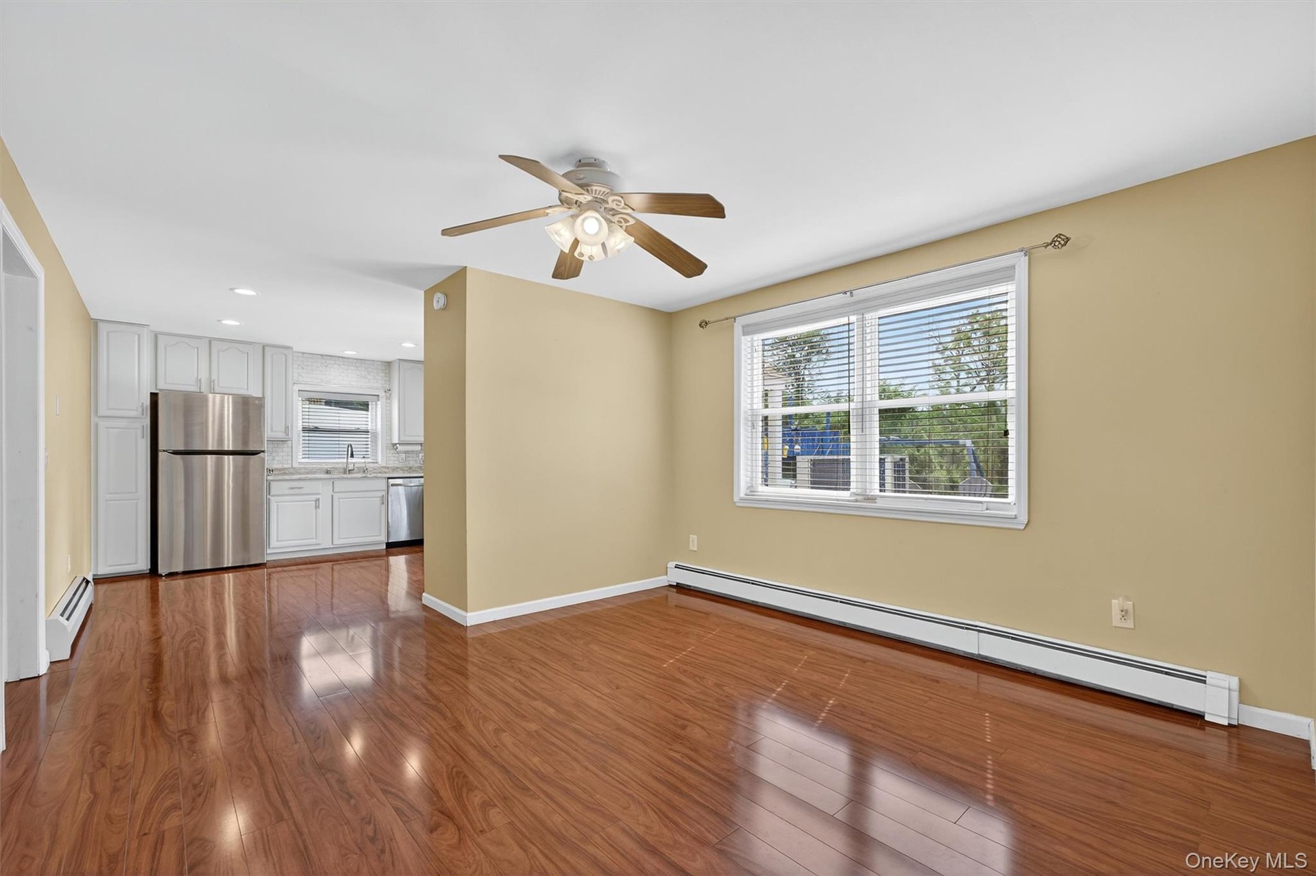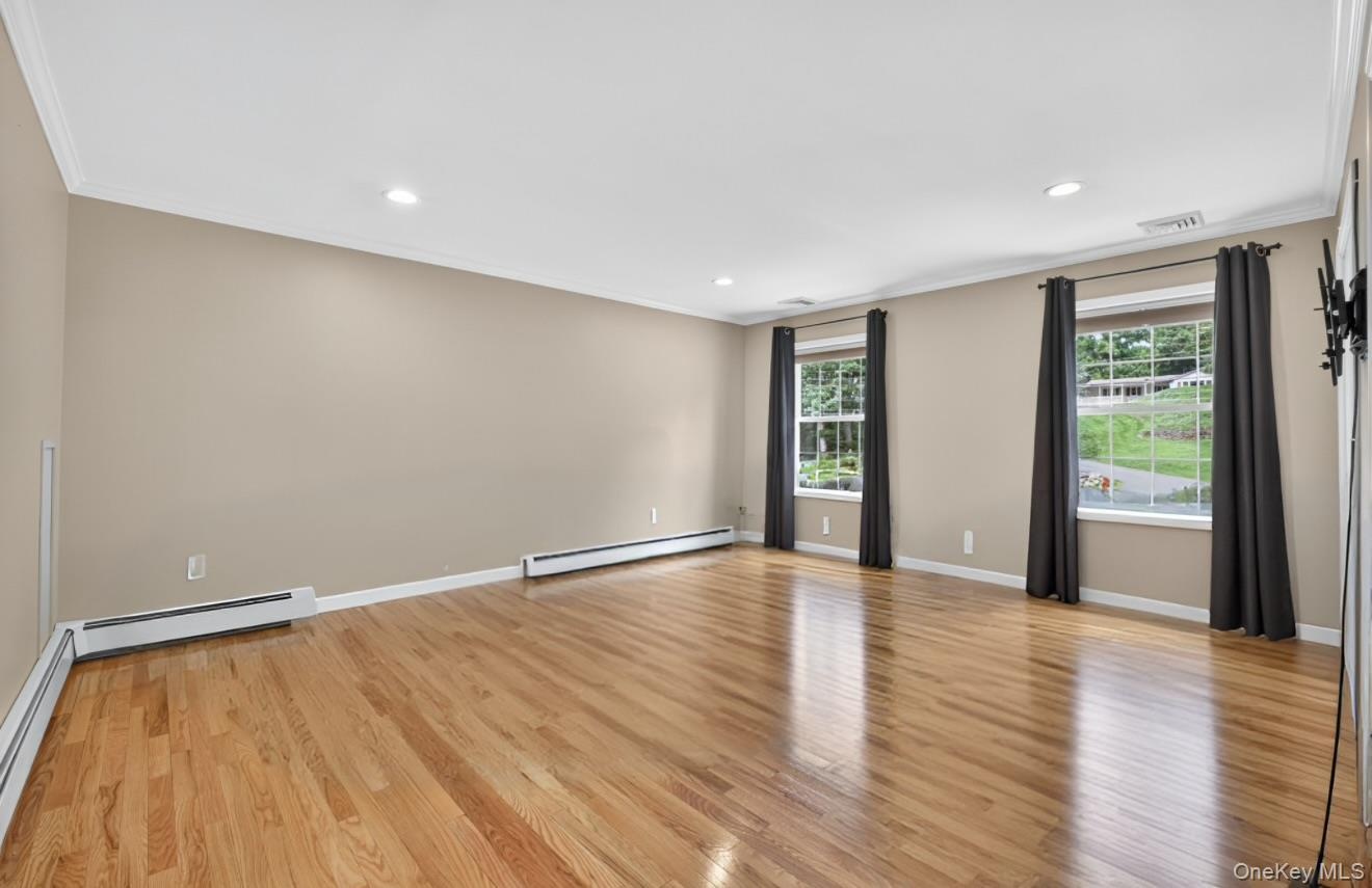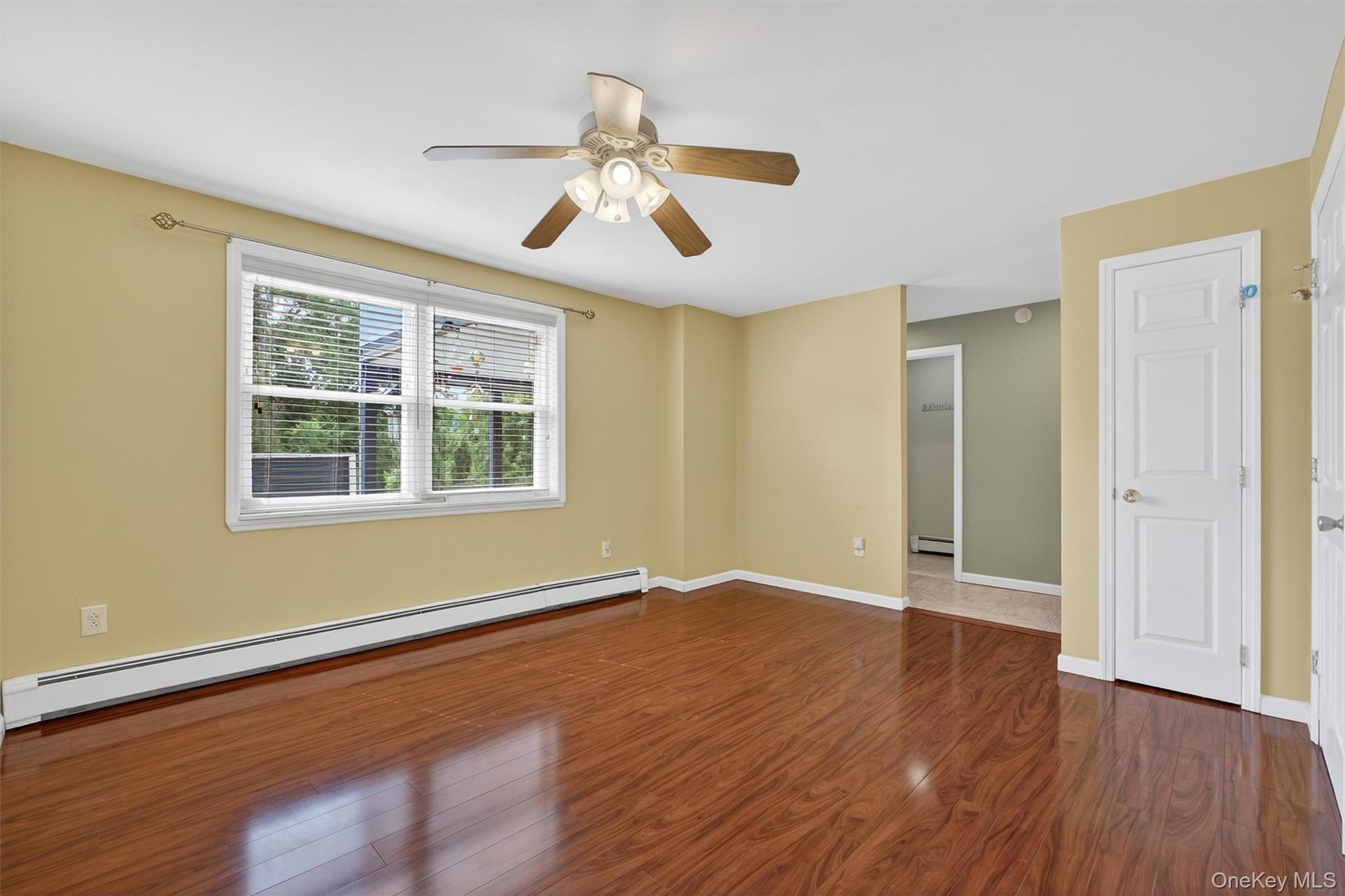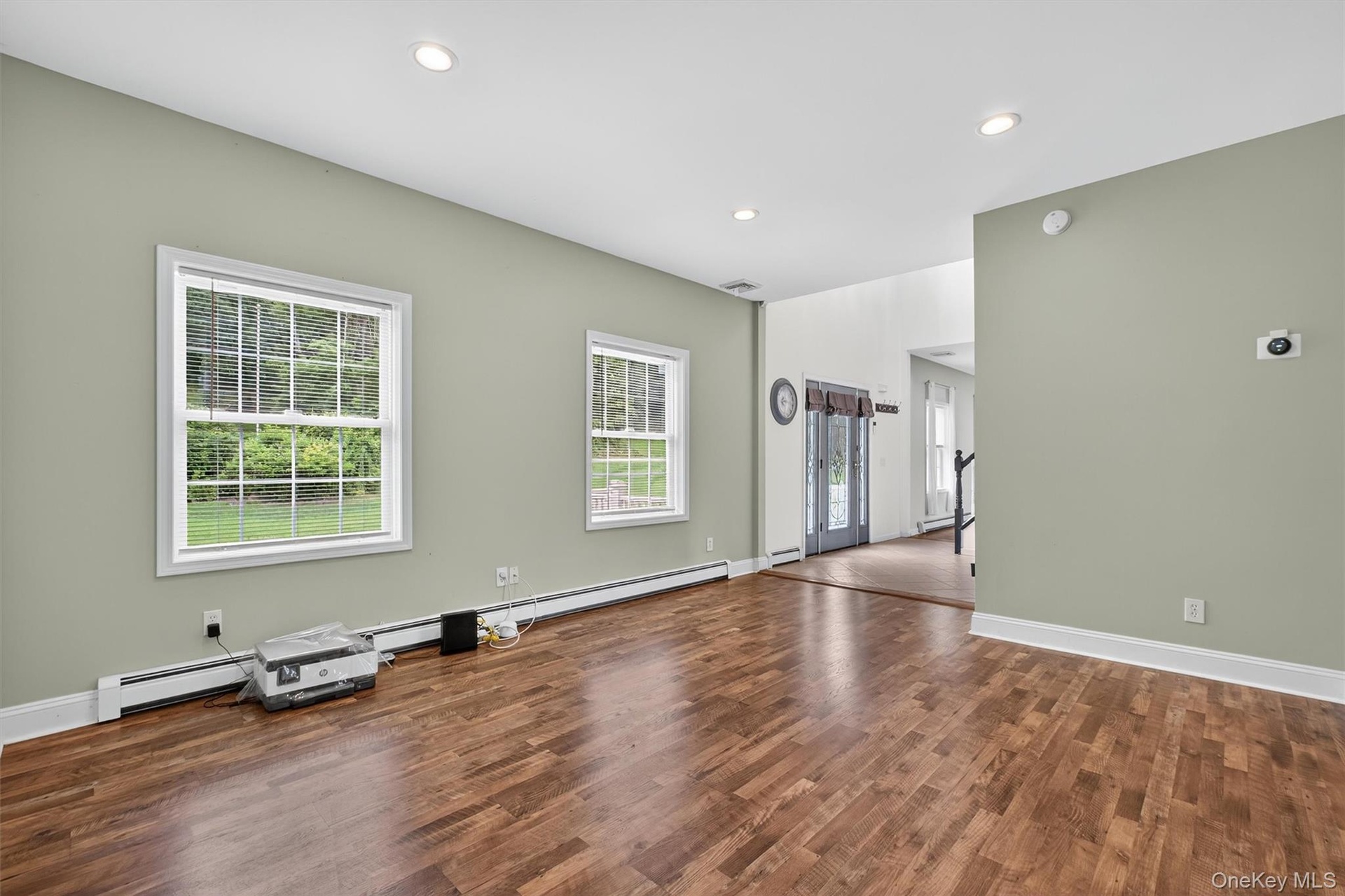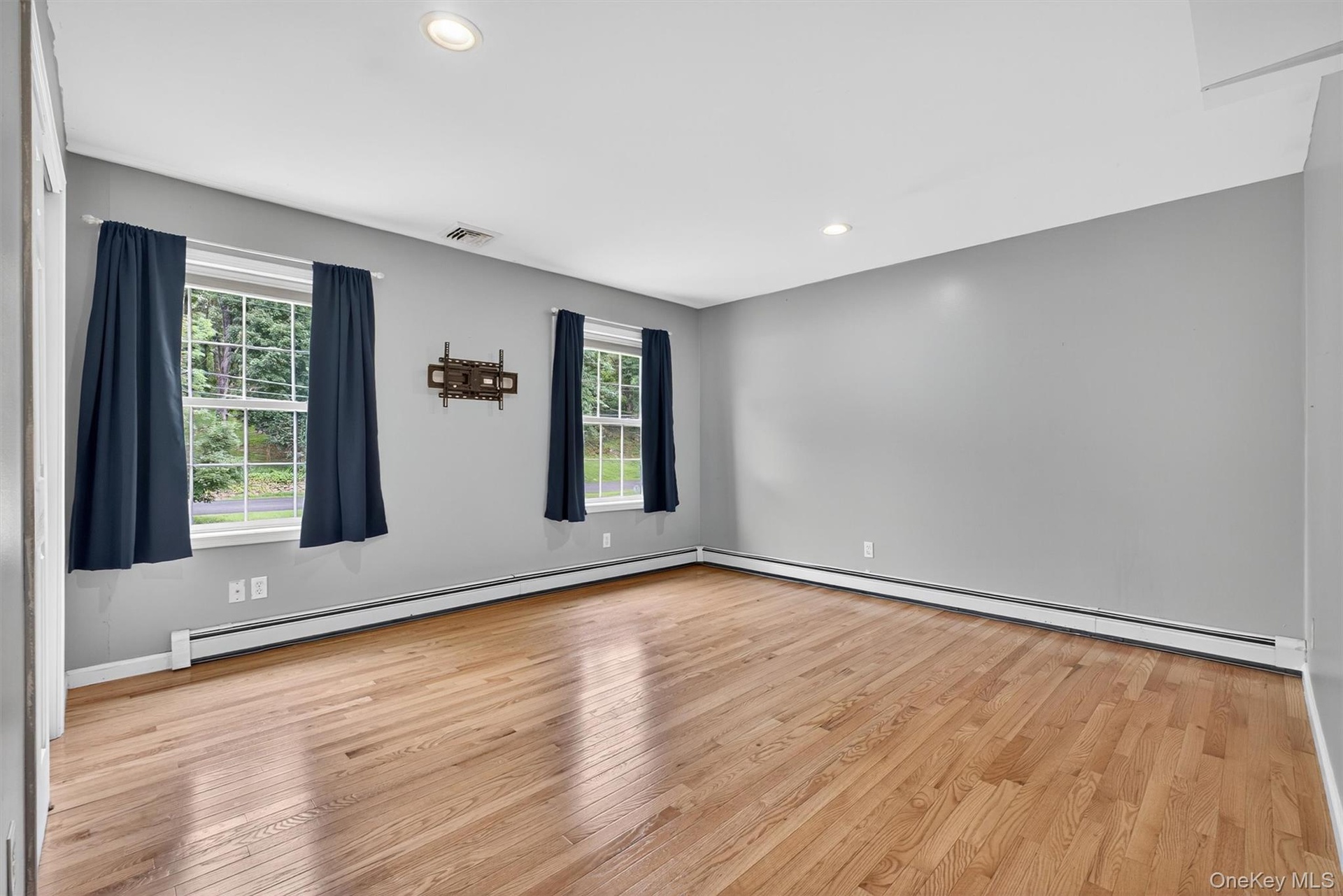 - Unfurnished room with wood finished floors, plenty of natural light, baseboard heating, and recessed lighting