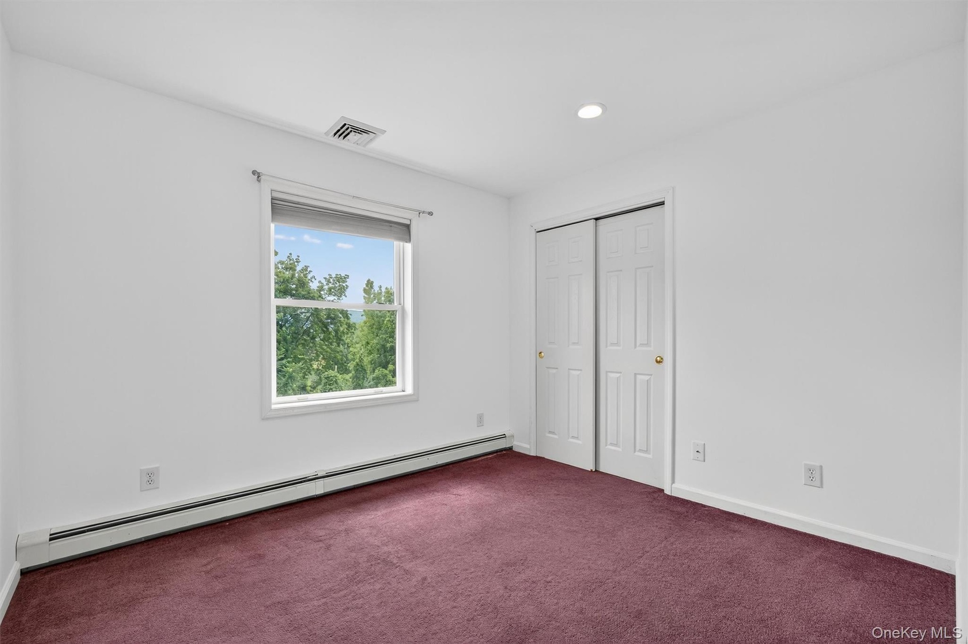- Unfurnished bedroom featuring a baseboard heating unit, dark carpet, recessed lighting, and a closet
