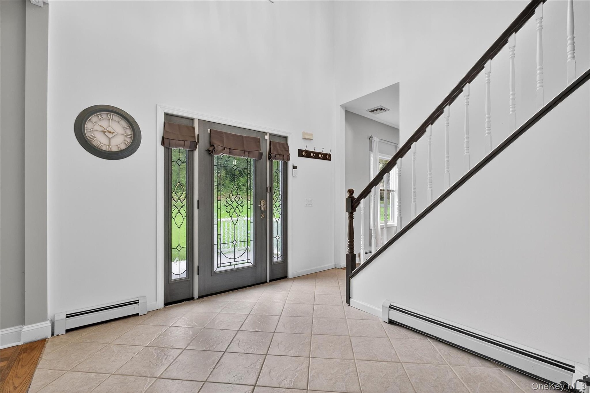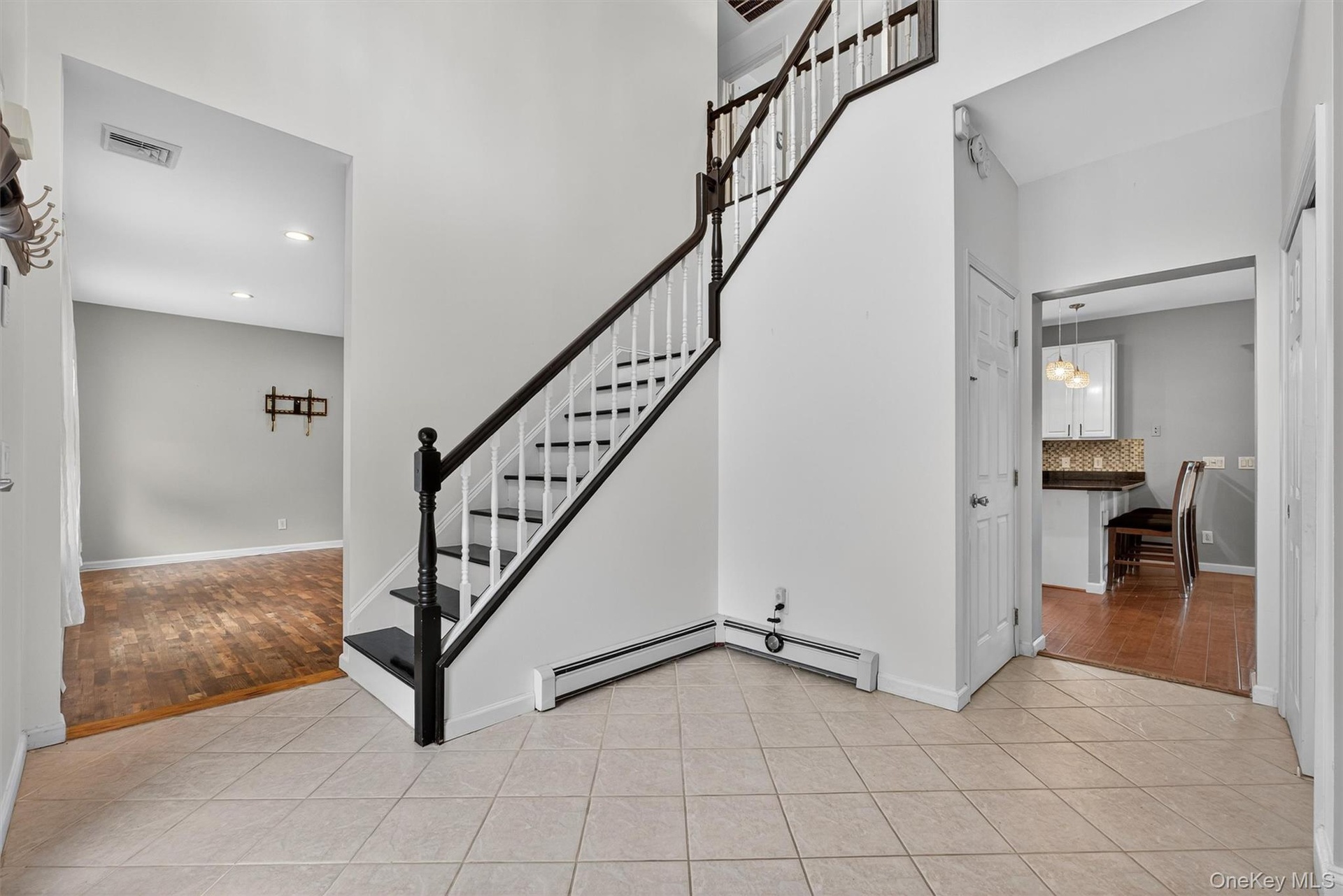 - Entrance foyer featuring a baseboard heating unit, a towering ceiling, stairway, and light tile patterned floors