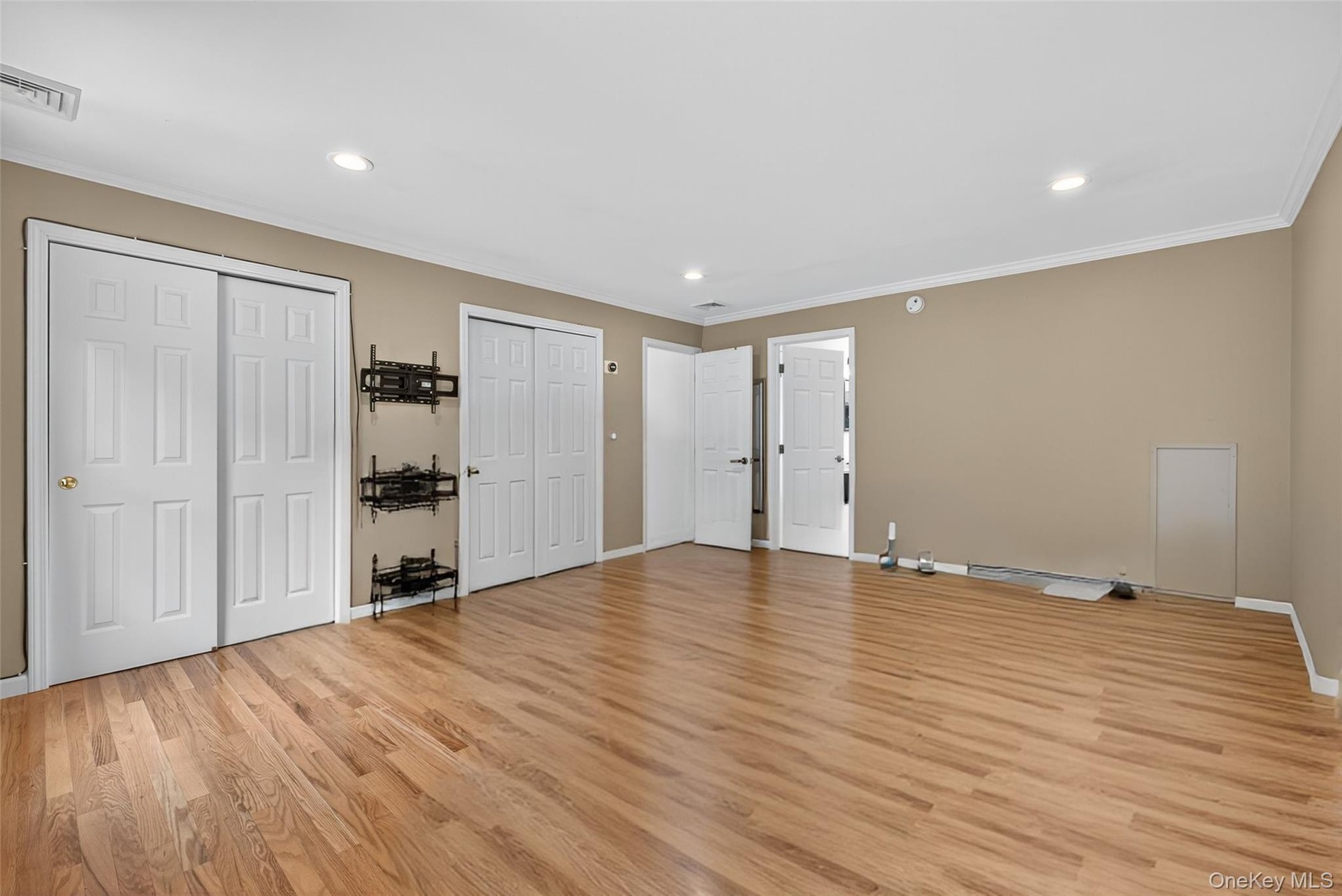- Unfurnished bedroom featuring two closets, crown molding, light wood-style floors, and recessed lighting