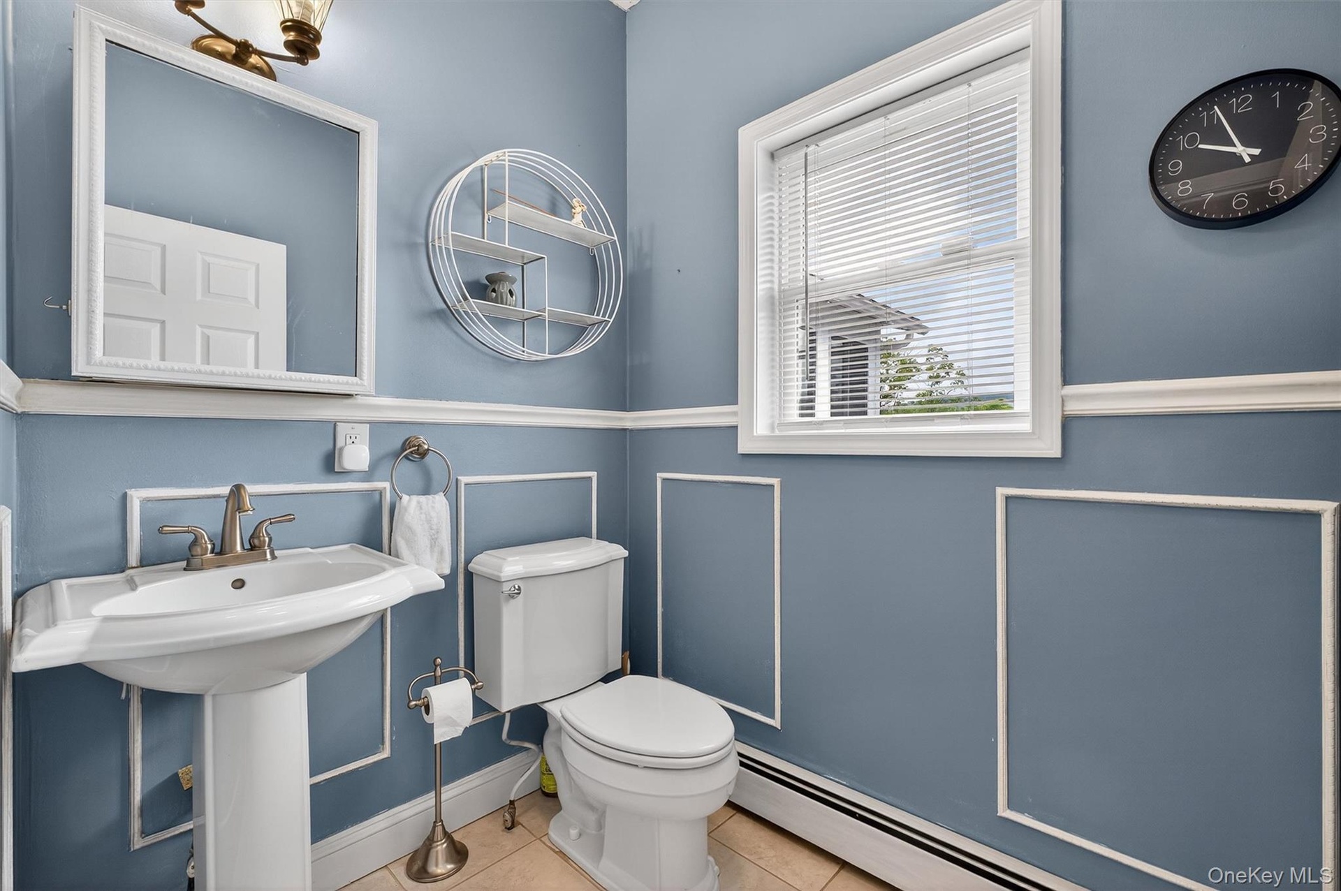 - Half bathroom featuring a baseboard heating unit and tile patterned floors
