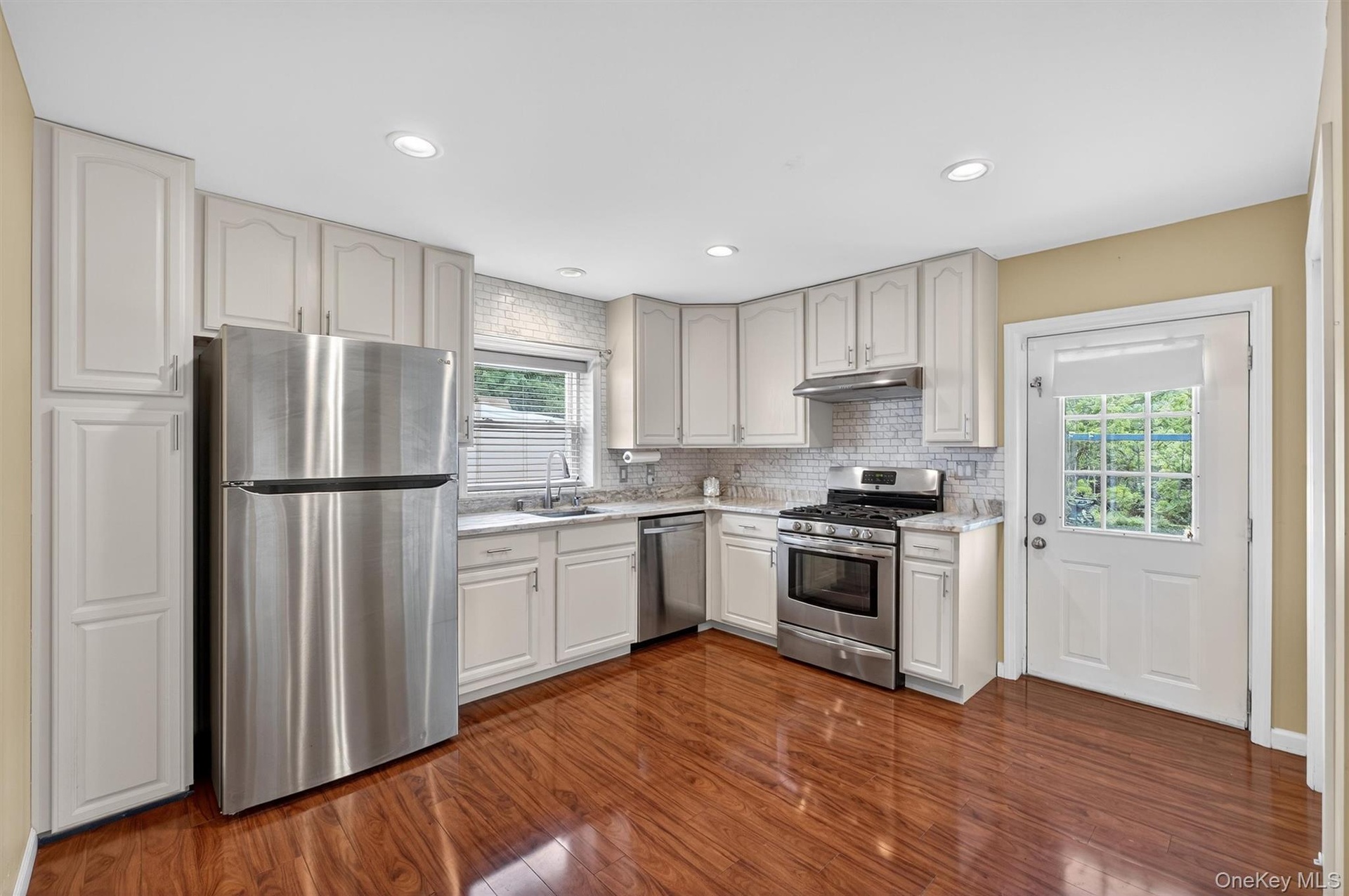 - Kitchen featuring stainless steel appliances, under cabinet range hood, plenty of natural light, wood finished floors, and recessed lighting