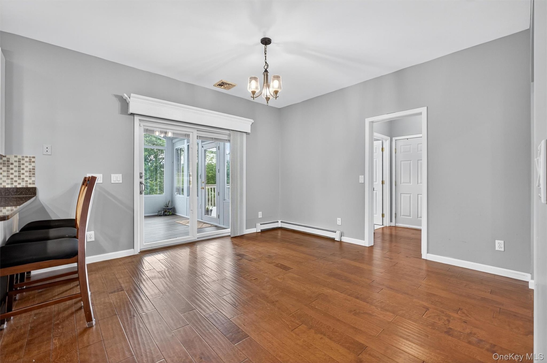 - Breakfast area featuring a chandelier, a baseboard heating unit, and wood finished floors
