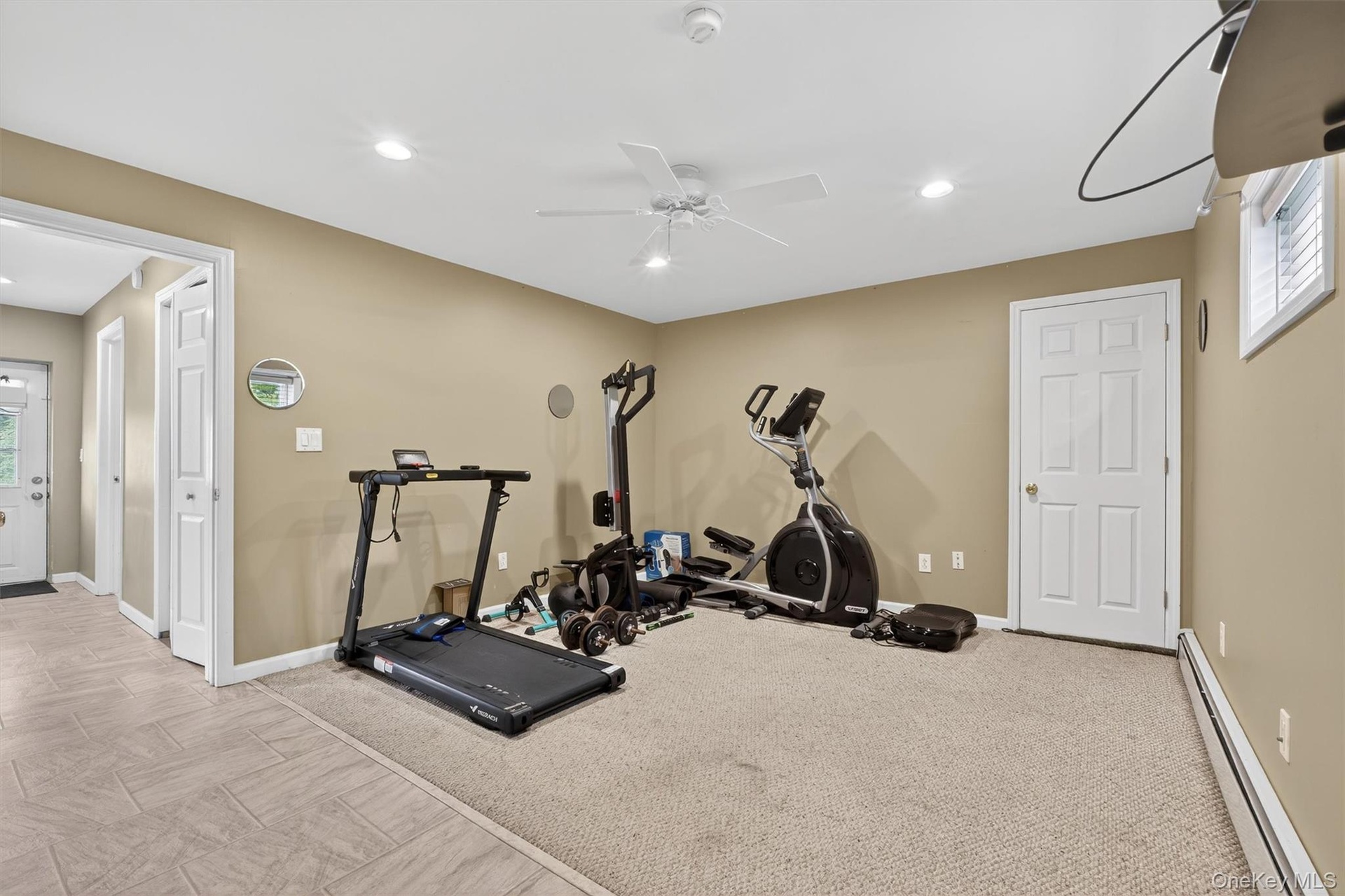 - Exercise area with baseboard heating, a ceiling fan, plenty of natural light, and recessed lighting