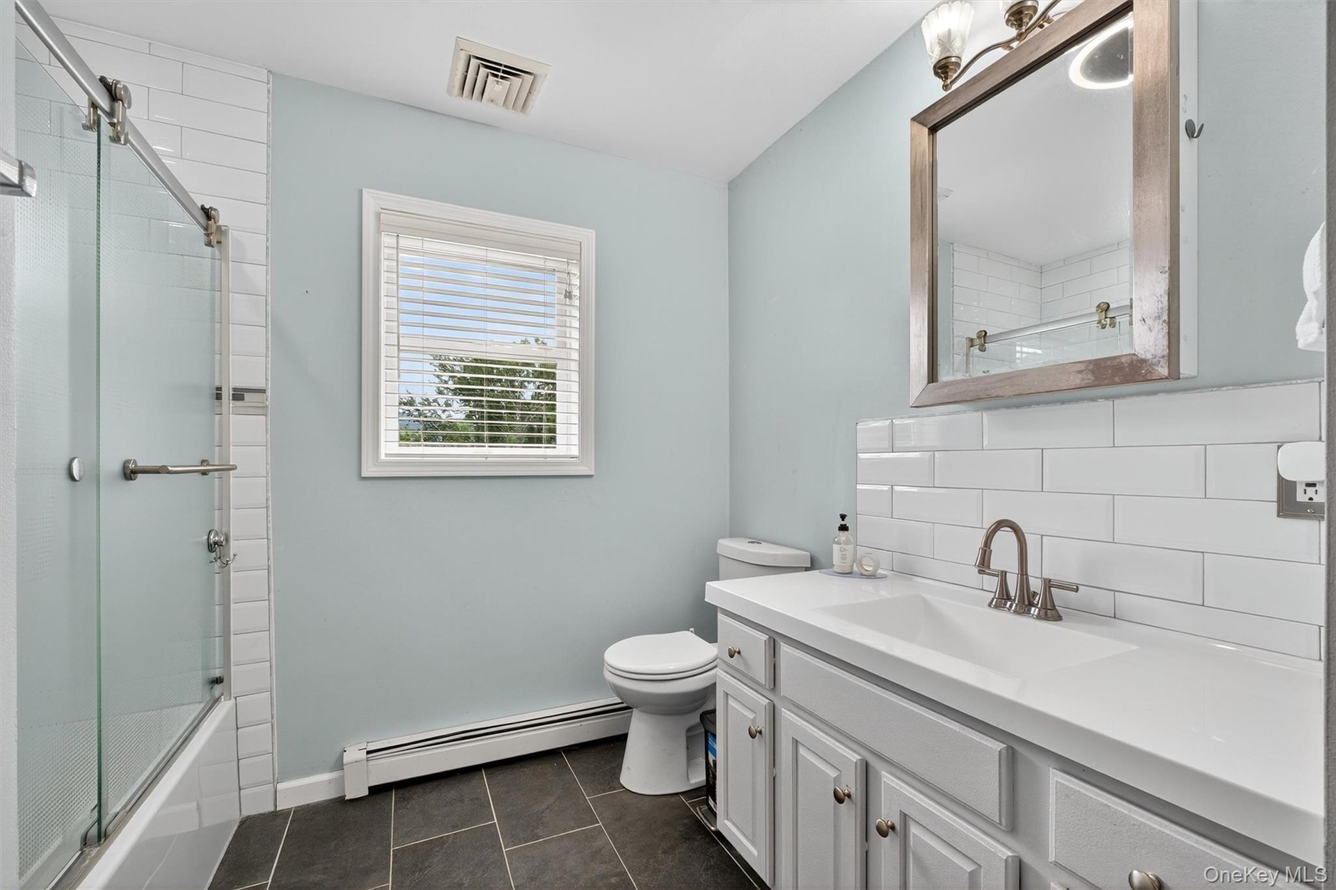 - Full bathroom with baseboard heating, tasteful backsplash, combined bath / shower with glass door, tile patterned floors, and vanity