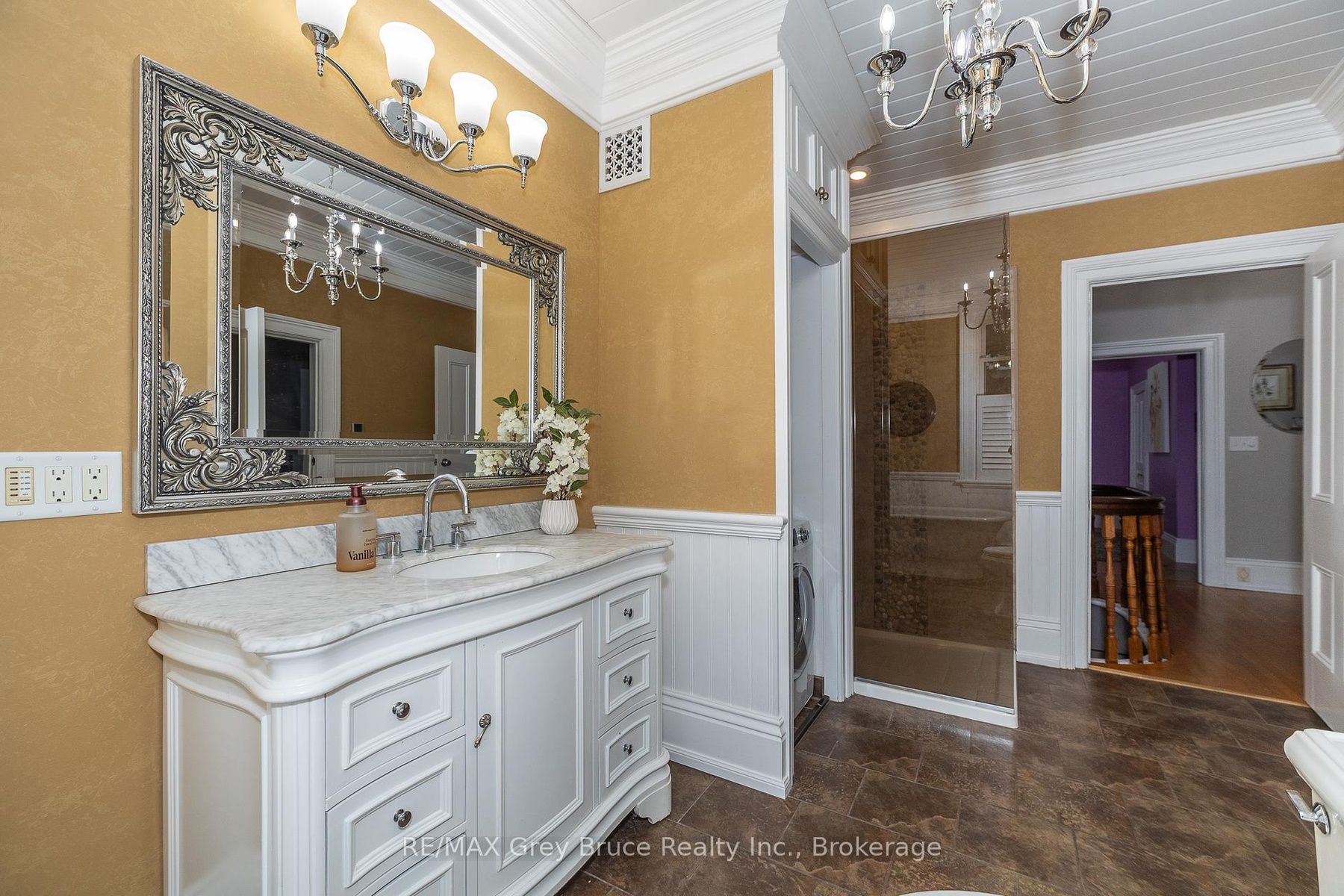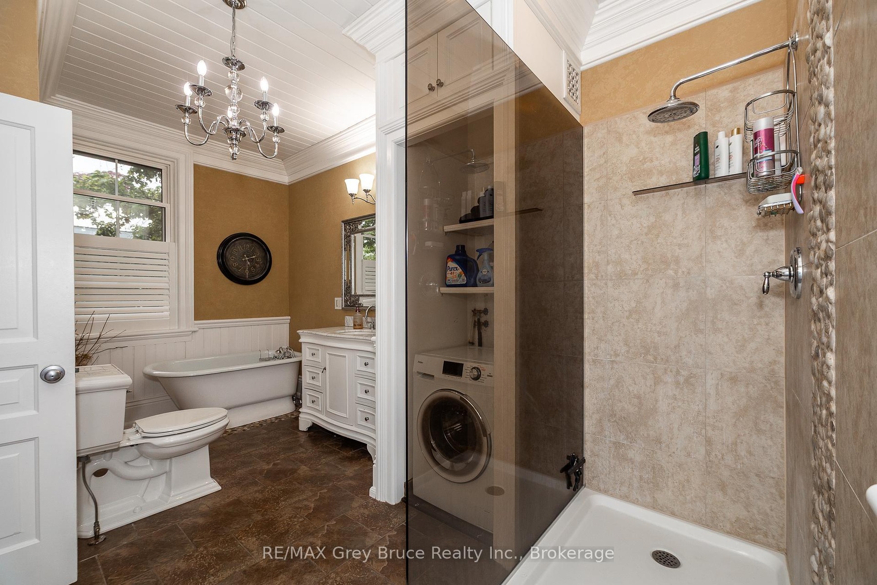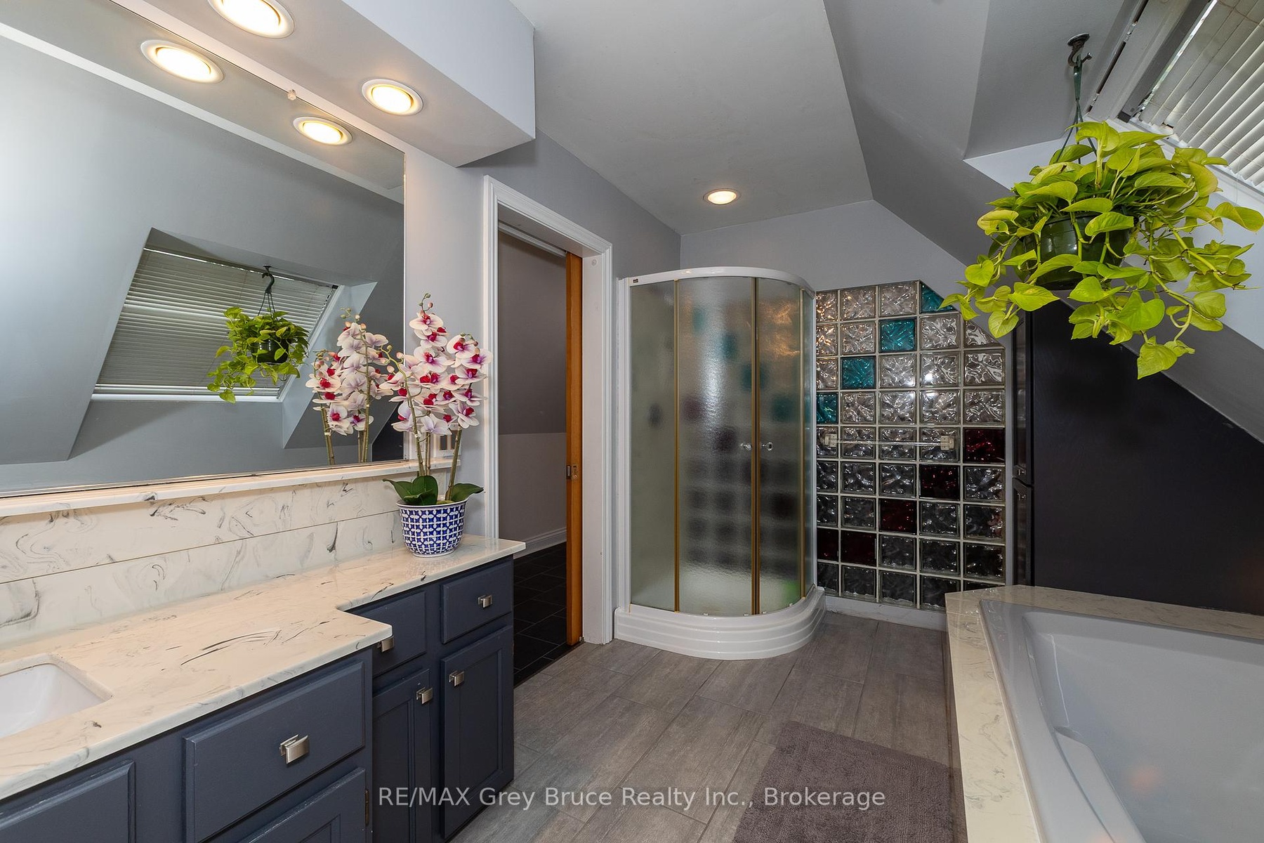 Historic elegance meets modern comfort in this beautifully renovated 1890s red-brick home on one of Owen Sounds most prestigious streets. Set among notable landmarks such as the former U.S. Consulate, Billy Bishop House, and James Harrison House, this property is just a short walk to the Mill Dam, Farmers Market, Library, and the vibrant River District. Inside, youll find rich hardwood floors, soaring ceilings, oversized windows, and a sun-filled living room overlooking the charming front verandah. The custom kitchen features quartz countertops and generous cabinetry, opening to a formal dining room perfect for gatherings. Upstairs offers three spacious bedrooms, a large family bathroom with laundry, and a stunning third-floor primary suite with skylights, a sitting area, and spa-style ensuite. Heated floors in both full bathrooms and the cozy back family room add year-round comfort. Outside, the fully fenced backyard is a private retreat with mature landscaping, waterfalls, pond, stone patio, and expansive deck for entertaining. Additional features include natural gas heating, central air, a separate exterior basement entrance, and a large 52 x 186.6 lot. This one-of-a-kind property combines charm, character, and an unbeatable location in the heart of Owen Sound.
